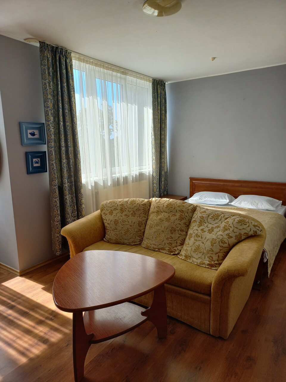 Гостиница имеет 2 звещда, по сути на столько она и есть, так что без иллюзий. Я поставила 3 исключительно из-за людей, которые там работают и вкусных кофе и блюд в кафе внизу. Из минусов: Фена в номерах нет, мебель совковая, раздолбанная, разномастная. Пришлось даже просить вешалки и второй стул. Убирались редко, раз даже не в три, а в четыре дня и то приходилось напоминать. Лески для белья натянуты не на всех балконах, о сушилках не слышали. Кондиционеров нет, да они и не нужны. Тапочек тоже нет. Минимализм, в общем. Но и стоимость невысокая. Все сопоставимо. Из плюсов. Расположение — близко магазины, море, остановки. Внизу приличное кафе, ресторан. Внутренний симпатичный, уютный дворик. В номерах были наборы для душа. И персонал. Приятные, отзывчивые, общительные. Александр нам помог взять машину напрокат, искал по собственной инициативе, нашел единственную свободную на всю область в тот день, благодаря чему мы отлично покатались по городам и замкам.