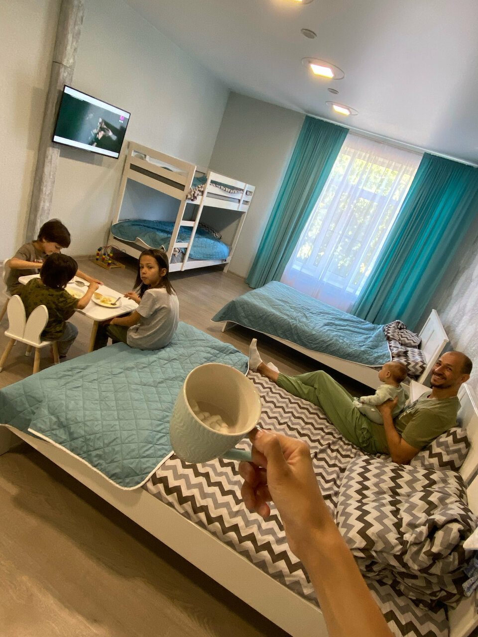 По пути в Геленджик, в режиме онлайн нашли этот отель, спасибо только на этом, пожалуй. Заехали поздно ночью в 00:30, дальше все не очень хорошо. Номер, типа, семейный. Сверху над 2-х спальной кроватью соорудили из хлипких палок кровать 2 яруса, которая качается от каждого движения ребенка. Санузла в номере нет, это большой минус. Персонала кроме уборщицы мы не видели вообще, спросить не у кого. Есть типа кухонная зона, она для кого??? Никаких мыльно-рыльных средств не предоставляется. В душевой нет мусорного ведра, пардоньте, вопрос к руководству, взяли шампунь одноразового использования, после него остаётся пакетик его куда кинуть? Бежать голым в туалет, который отдельно от душа? За 3тр получить ‘это’, это конечно нонсенс. Отель, может, и неплохой чисто визуально, а по сути отношение к постояльцам и их нуждам — 0! Цена качество — 0! Поверьте, нам есть с чем сравнивать, это третий отель на нашем пути следования и он нас разочаровал. Подумайте, прежде чем бронировать данный отель!