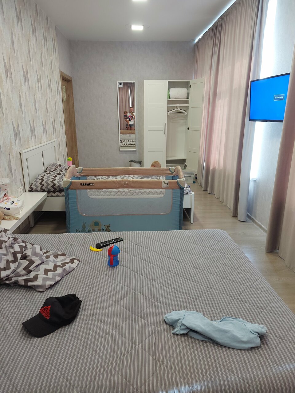 Это худшая моя ночь в жизни, мы едим с Крыма соотвественно цель выспаться. Ну как можно выспаться на досках с тонким самодельным куском тонкого паралона. мухи не дали выспаться, замучили всю ночь. В общем за 3800, мы на берегу моря за 4 снимали, имеем мух, спину, лучше в машине))) ребёнок вообще на досках в манеже спал, соотвественно истерика до 3х ночи. Встали в 6 и поехали. Вывод отель явно не для сна, с девочкой в бассейне и в номер! Кто с дальний поездки не советую вообще и близко не подходить. Сам номер нормальный. Все есть даже стиралка тут вопросов не имею