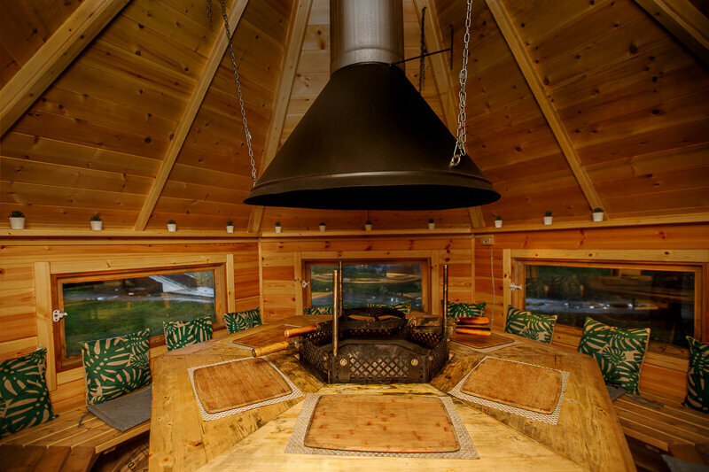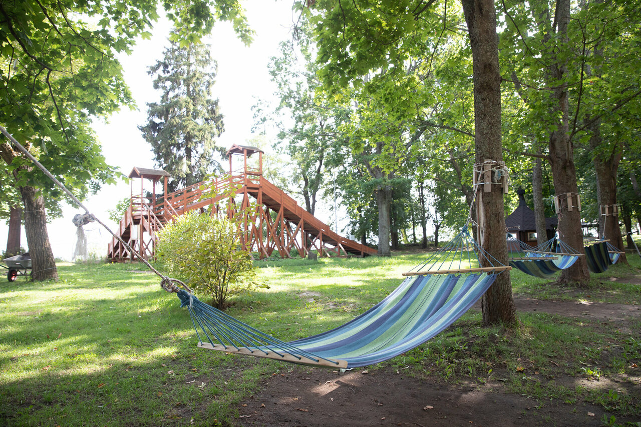 - Красивая природа вокруг (сосны, кусты шиповника, гамаки).