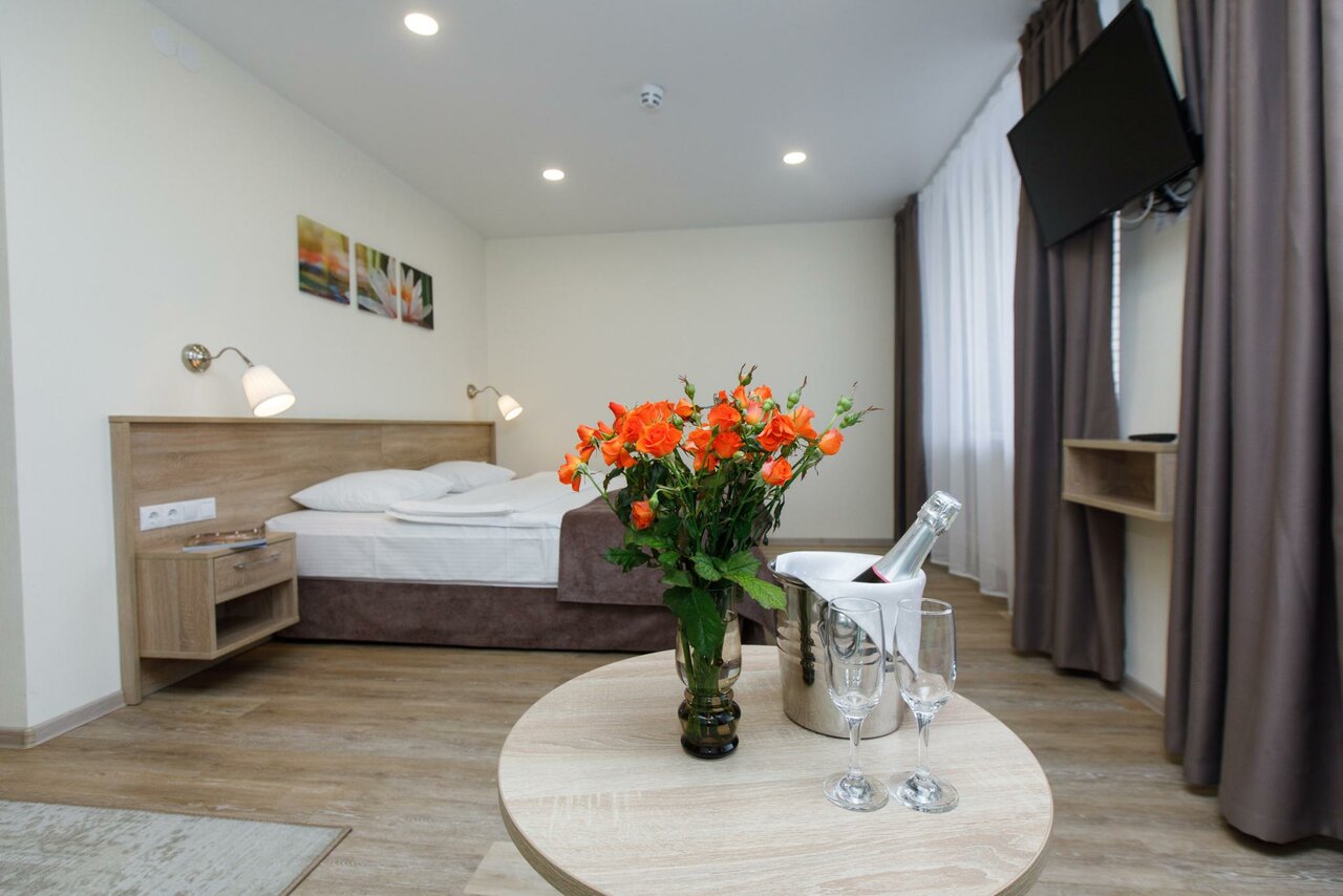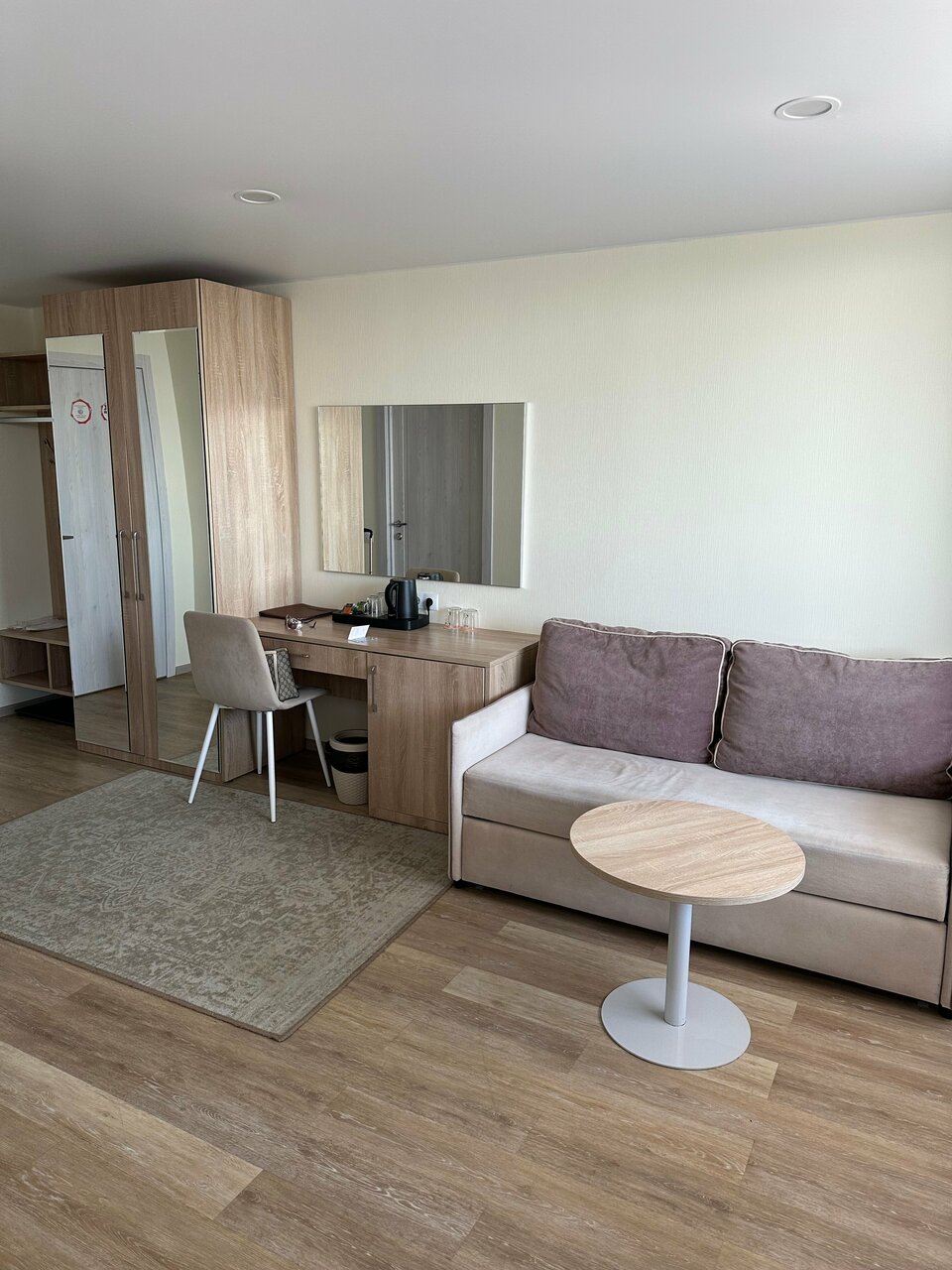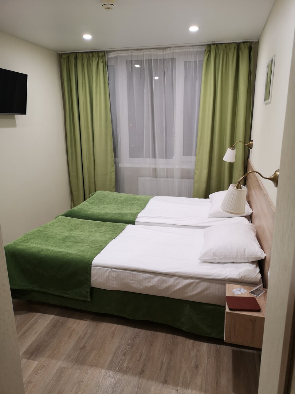 Хороший чистый номер, очень вкусные завтраки шведский стол, всё свежее. И главное на автобусе можно доехать, а рядом остановка для каршеринга. Я довольна