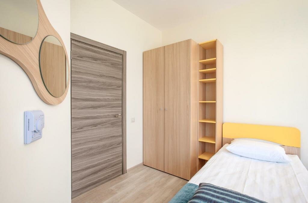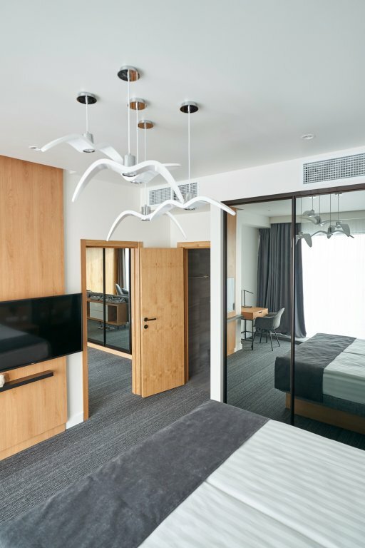Удобства: номера с кондиционером, санузлом, звукоизоляцией, телевизором и Wi-Fi; парковка, лифт, круглосуточная стойка регистрации.