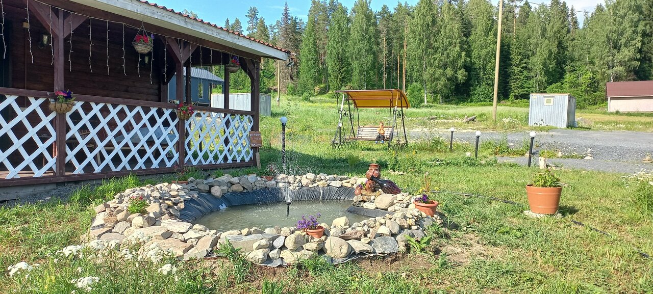 Жили в домике с фонтанчиком в середине июня) очень понравилось, пение птиц круглые сутки) белые ночи) в шаговой доступности рускеальские водопады, знаменитые красотой и тем, что там снимали эпизод фильма ‘ а зори здесь тихие’. Деревянные скульптуры у водопадов заслуживают высокой похвалы!!! При входе в парк водопадов: удобная парковка и местные продавцы с карельским вареньем) На фото домик, в котором жили