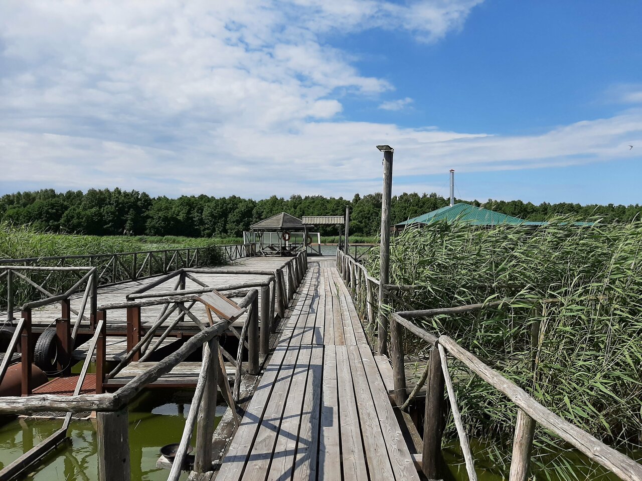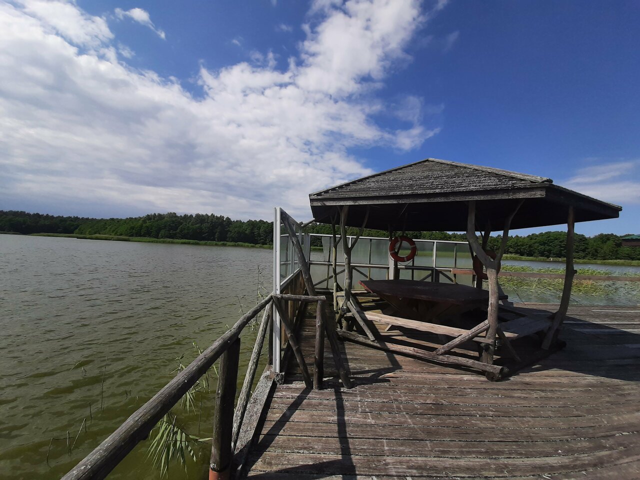 На берегу озера расположена беседка для комфортного отдыха