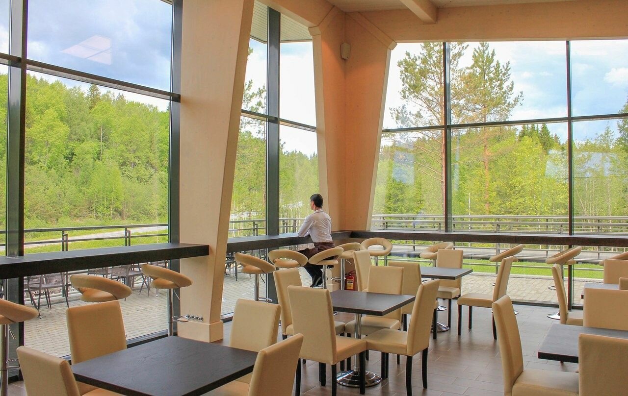 По пути, проголодавшись, решили заехать в кафе при гостинице. Сама гостиница находится в отдалении, на берегу озера. Кафе в скандинавском стиле расположено у трассы. Очень качественное удобное здание с террассой, чисто и комфортно. Очень вкусная еда. Дороговато, но очень вкусно и сытно. Персонал очень вежливый и терпеливый, молодцы! Обязательно сюда вернёмся!