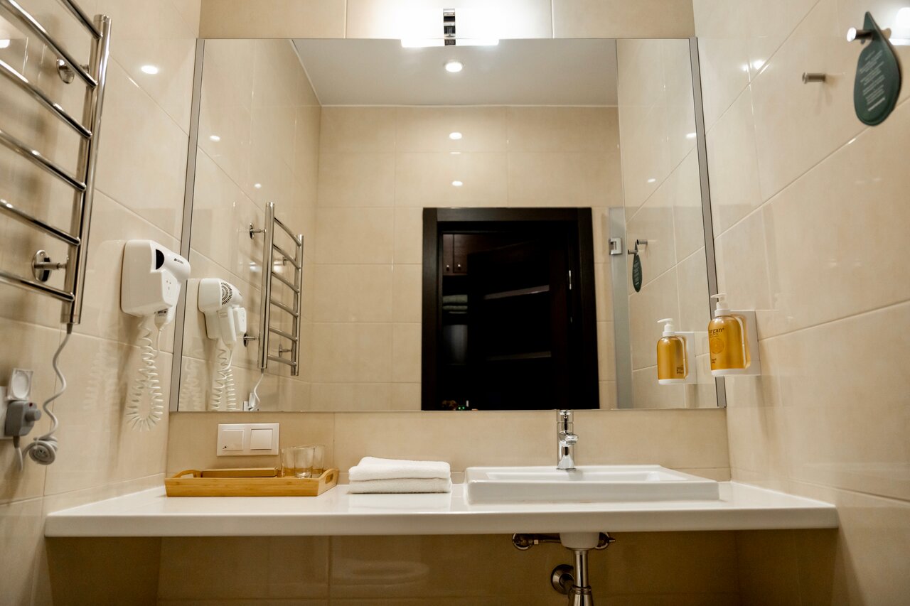 Номера (от 7000 до 10000 ₽/ночь) оснащены кондиционером, санузлом, холодильником, TV, Wi-Fi, феном, чайником и кофе. Есть кухонные уголки, сейфы и утюги.