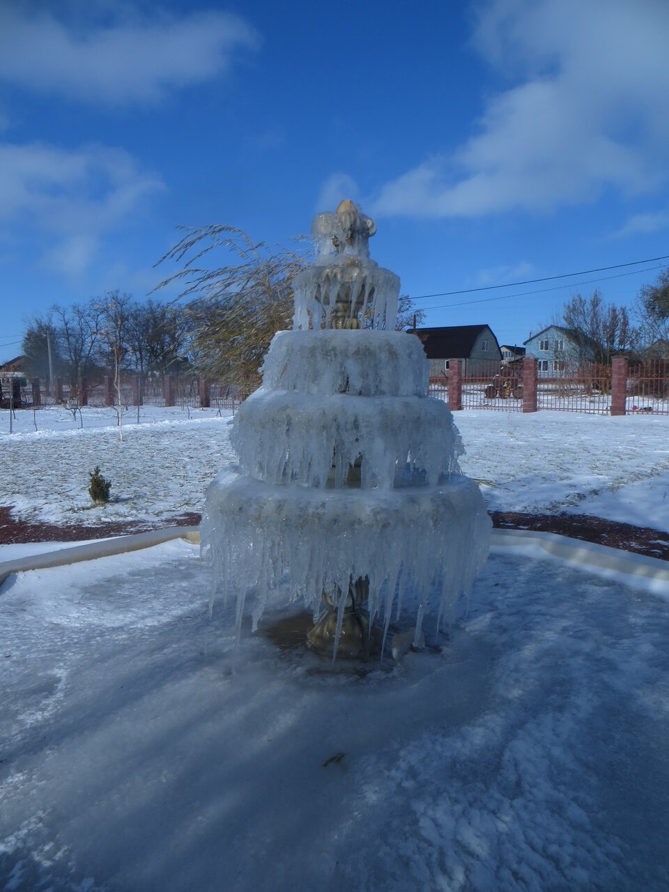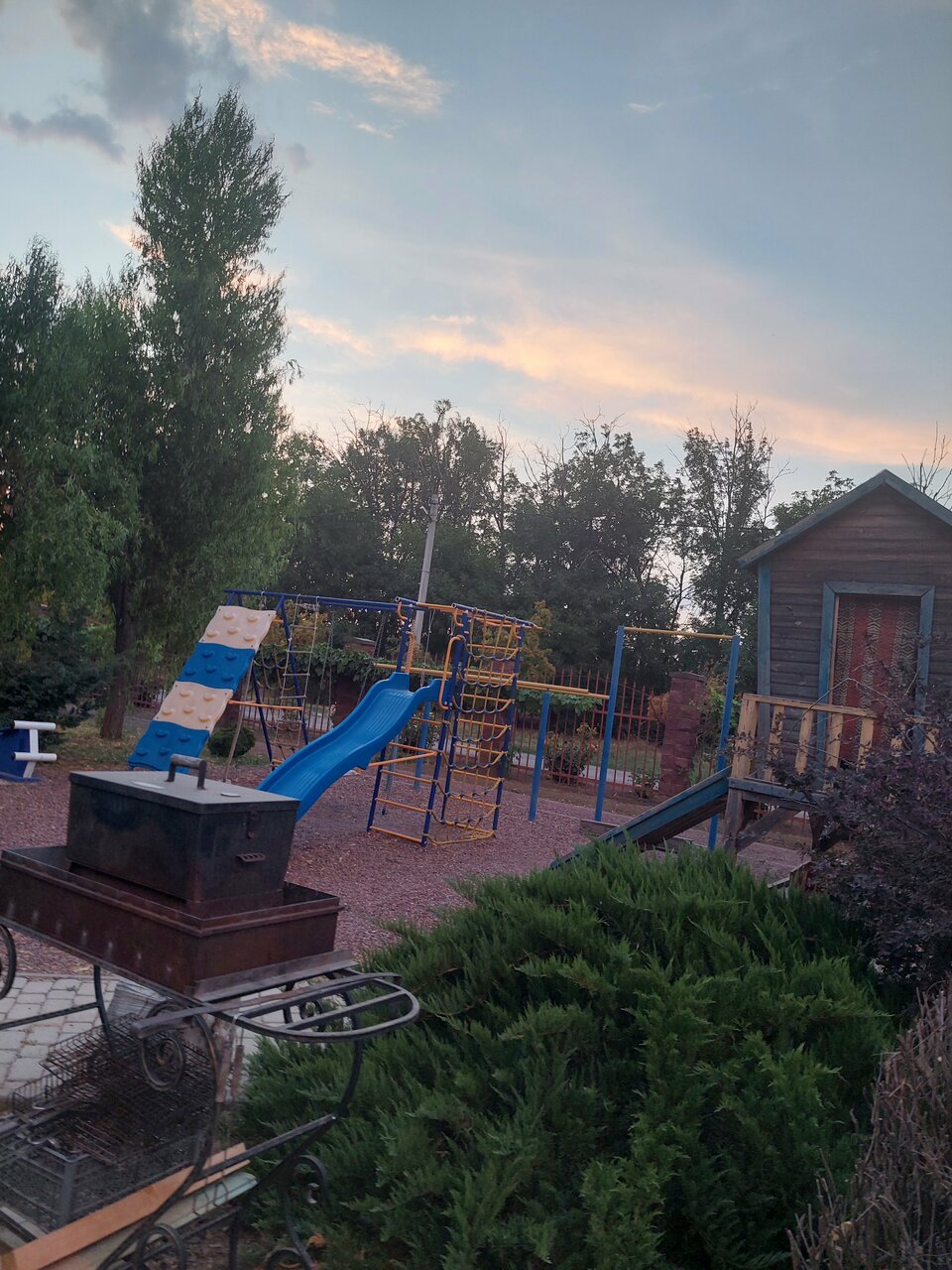 - Прекрасный двор с качелями, фонтаном и деревьями.