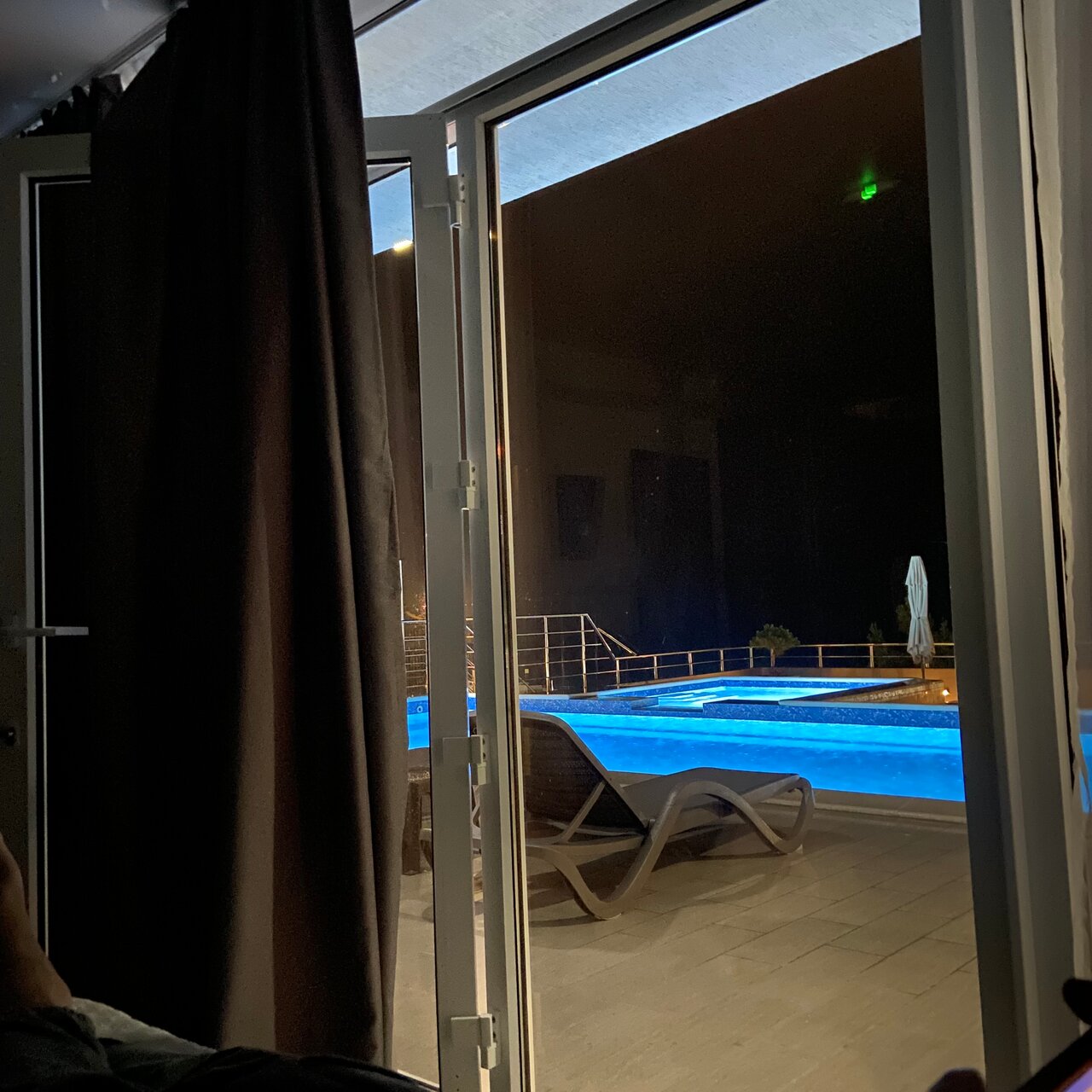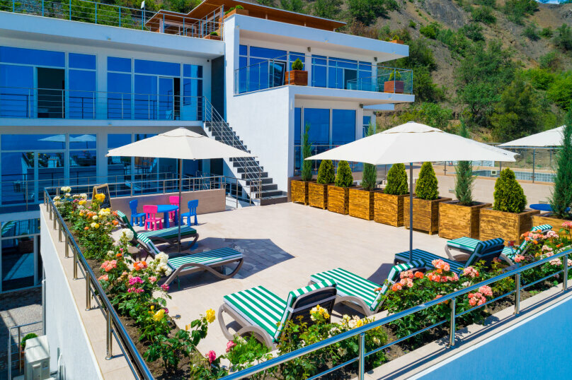 - Дружелюбный администратор.; Красивый вид на море и побережье.; Удобное расположение (не в городе, но близко).; Цветы и бассейн с подсветкой.; Отсутствие шума из-за малого количества номеров.