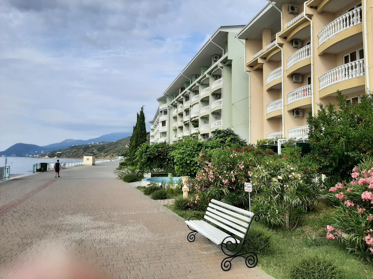 Отличное расположение на берегу моря! Чисто! Отличный вид. Детские площадки для детей, батуты. Продуктовые магазины. Кафе с вкусным питанием