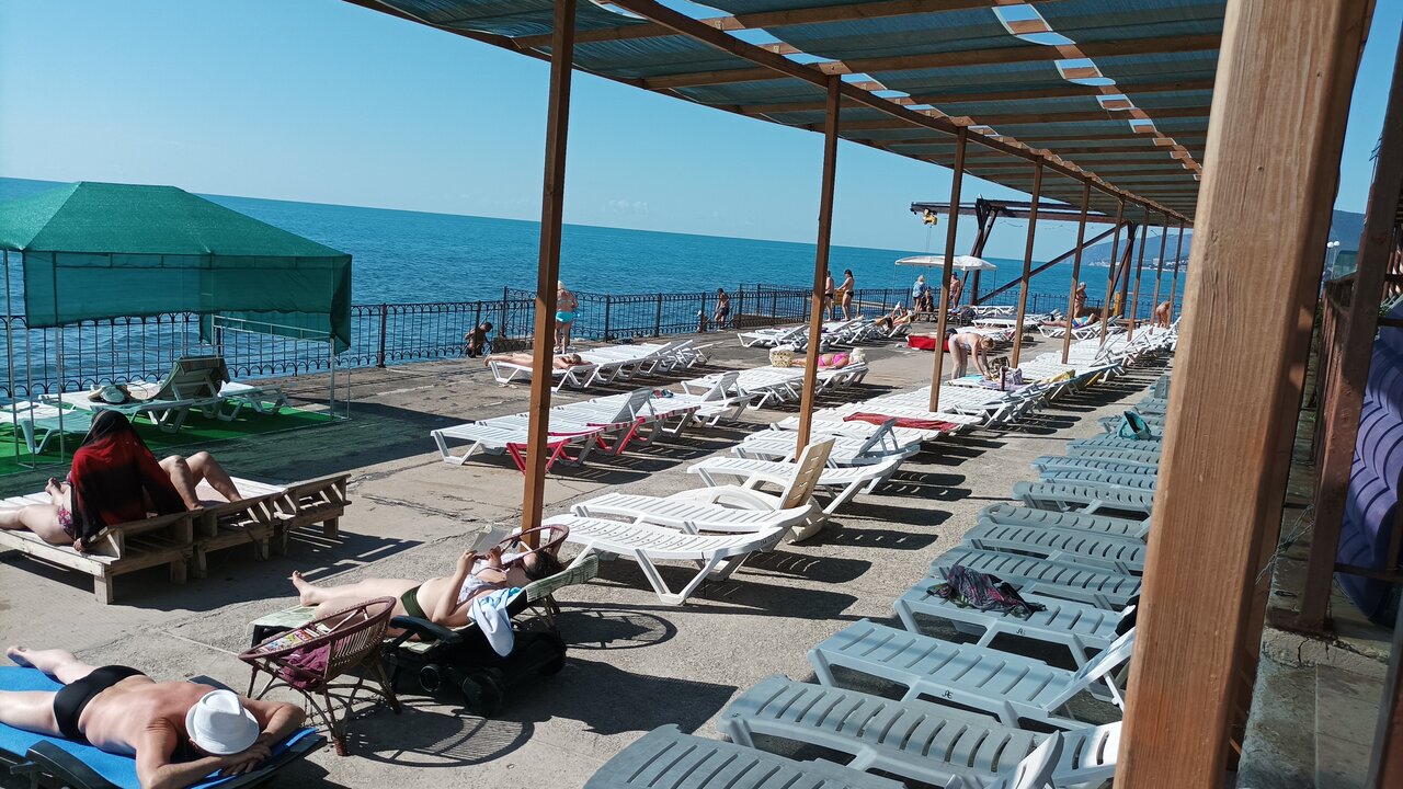 Второй раз возвращаемся сюда. Место отличное тем, что закрытая территория, так что адского муравейника не бывает. Почти у каждого эллинга есть свои шезлонги. Кафешка, правда, стала прям дороговатой по сравнению с предыдущими годами. Есть небольшой магазинчик с самым необходимым. Ну а так всё вполне культурно для Крыма. Не лакшери, конечно, но более, чем норм.
