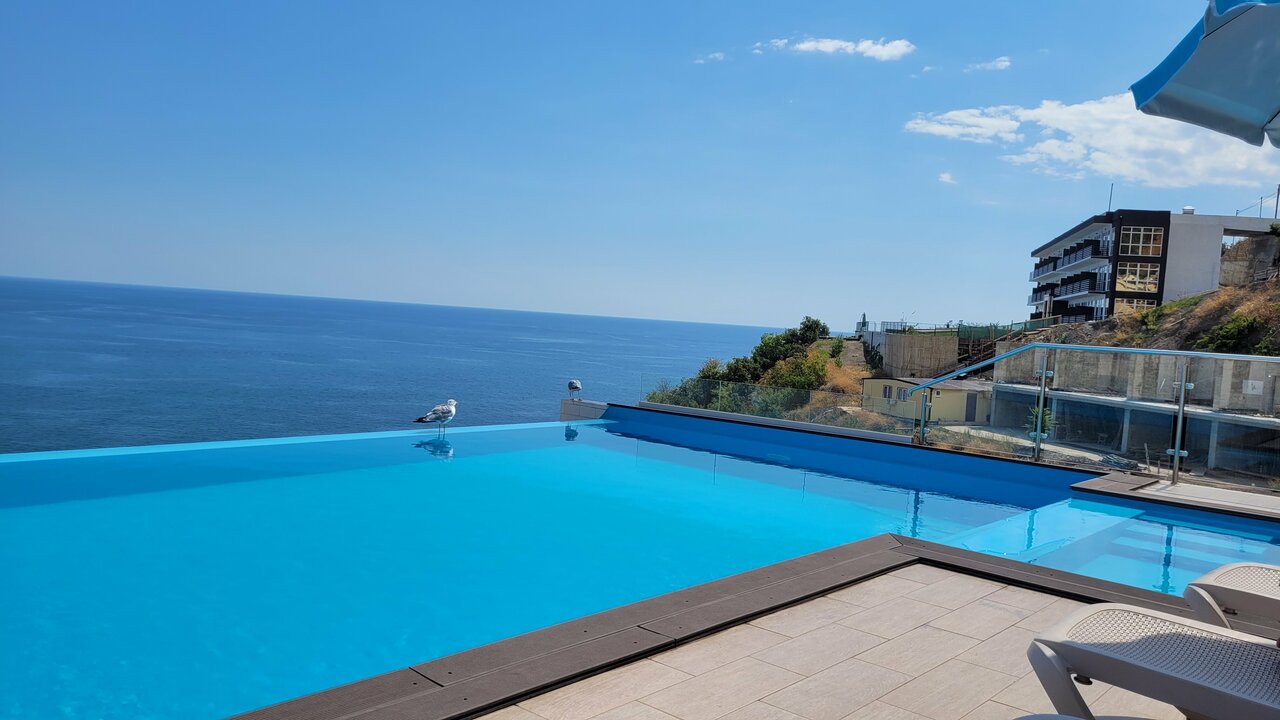 Отличное место,очень рад ,что посетил.вид с балкона шикарный.бассейн отличный чистый.были с семьей и ребенок в восторге от подогреваемой воды.в номере чистота и порядок.сухо.проблемный спуск к морю,но не критично.посещали в2022г.май июнь