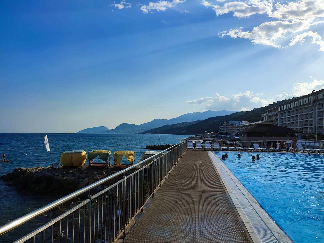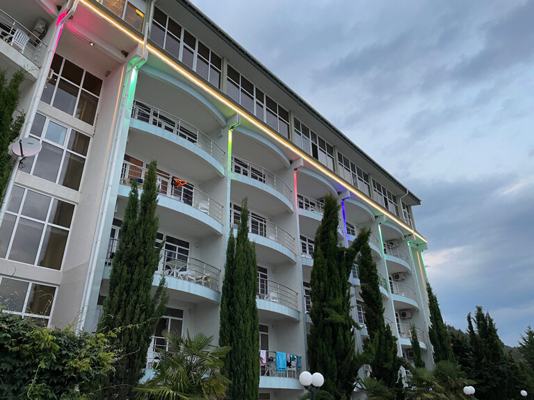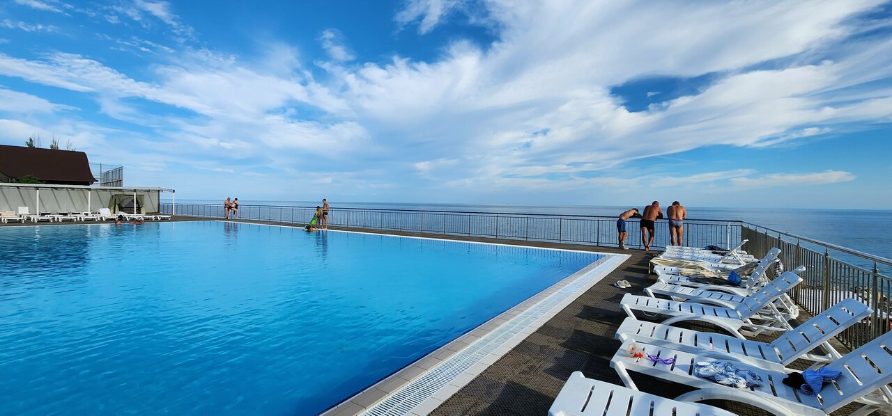 Отель понравился! Отдыхали в конце июля 2022 года в номере люкс. Номер просторный с огромной террасой. Правда нет лифта, но нас это не смутило, ходить по ступенькам полезно. Особенно если учесть, как вкусно и сытно мы кушали! Еда не очень разнообразная, но ооочень вкусная! Всегда есть и мясо, и рыба, и курица. Уборка каждый день, ежедневно в номер дают две 1,5-литровые бутылки питьевой воды. Вечером есть где прогуляться, вдоль моря расположены три отеля с набережной. Есть магазинчики, кафе. Также рядом находится пансионат ФСИН, можно погулять и там, территория большая, можжевельники и кипарисы, воздух просто восторг! Очень порадовал бассейн с морской водой, он на набережной, рядом с морем, очень удобно. Всегда были свободные шезлонги, но это возможно потому, что отель был заселён не полностью. В целом, место отлично подходит для спокойного семейного отдыха.