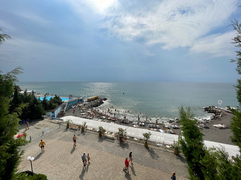 Хороший отель, классное место, никого из проезжающихся мимо, только кто проживает на этой территории. Хорошая большая территория, есть парковка внутри отеля и наверху. Лежаков хватало на всех. Хороший дружный и вежливый персонал.
