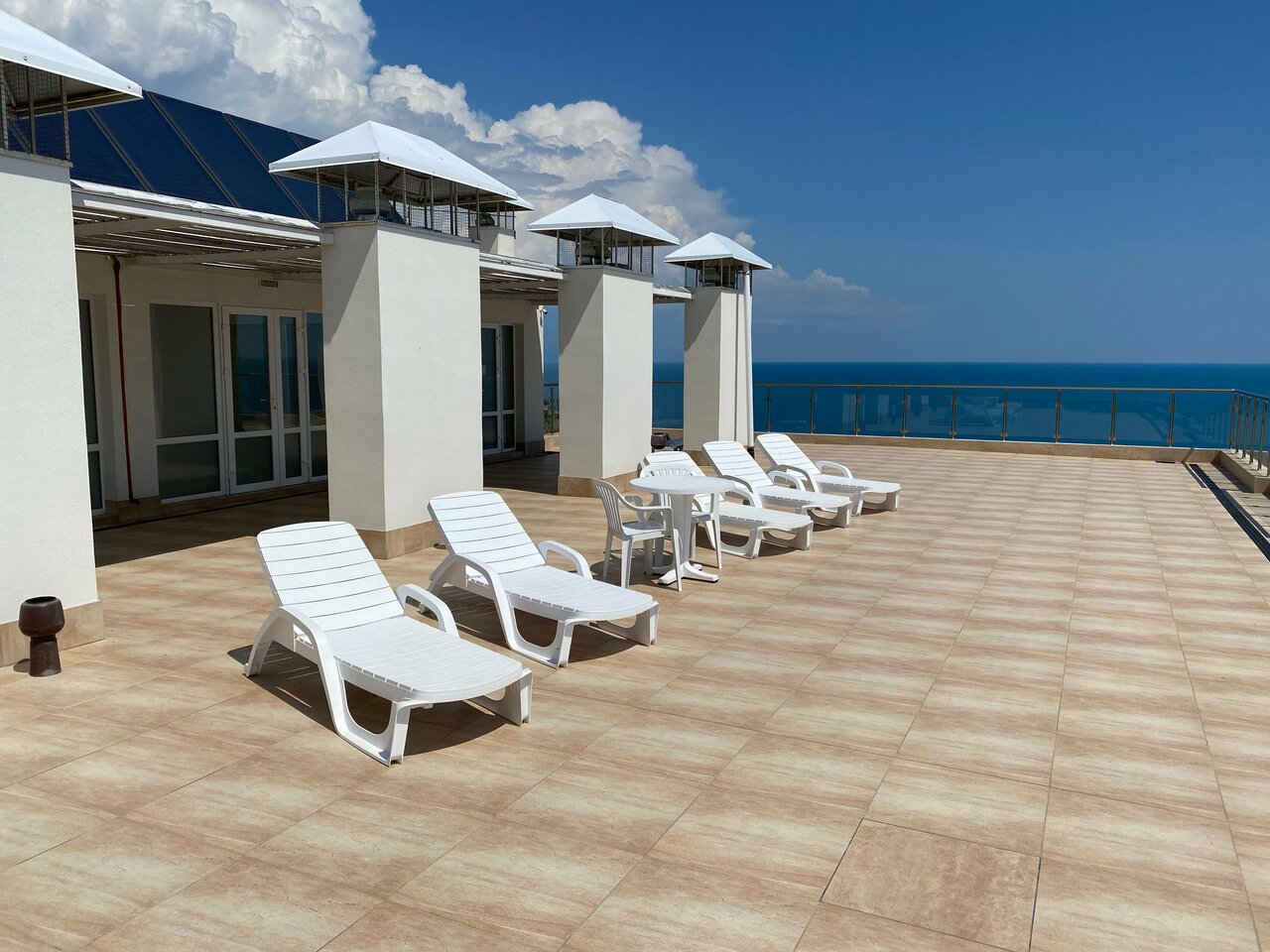 - На крыше есть зона для загара с шезлонгами и душем.