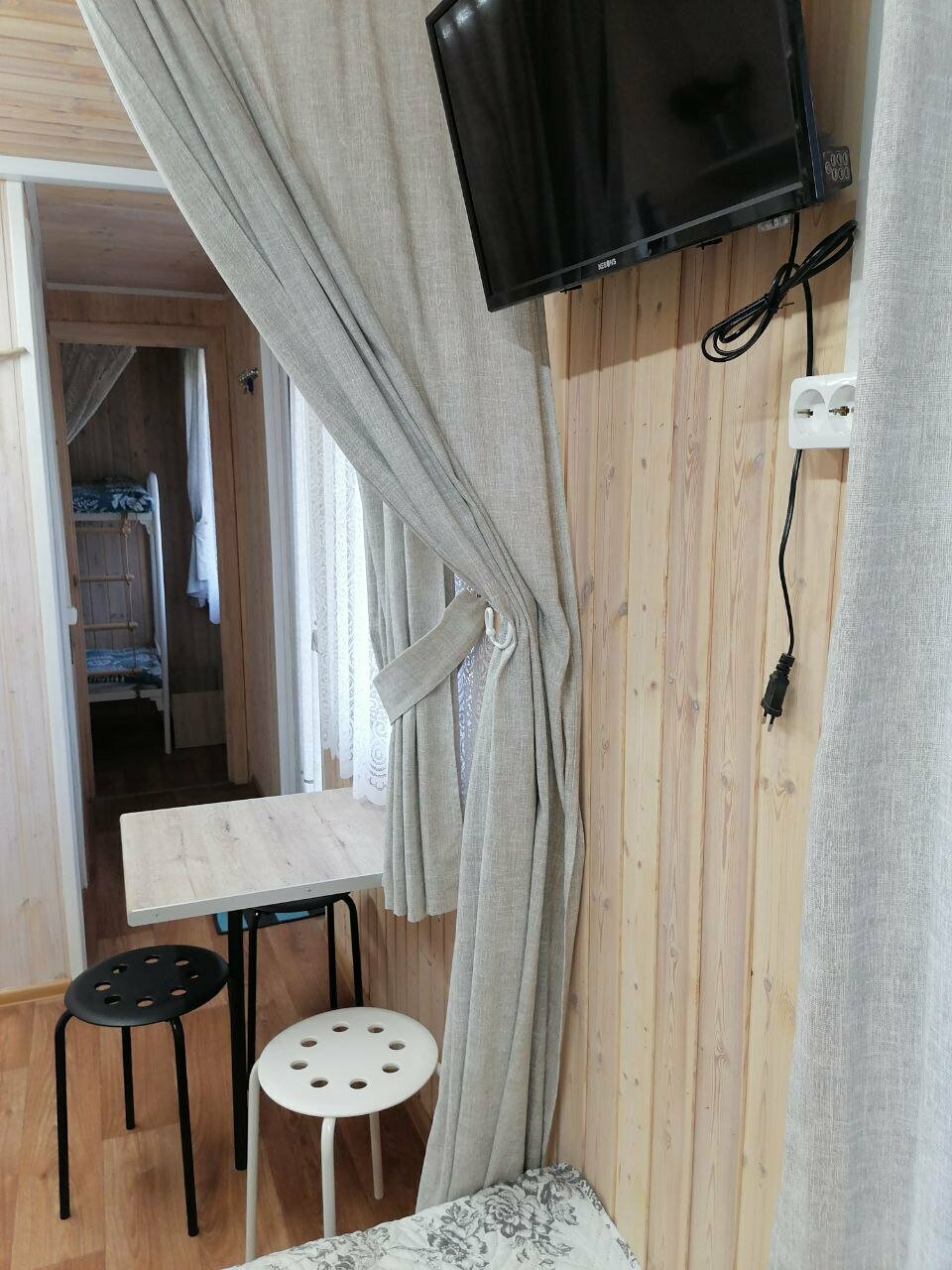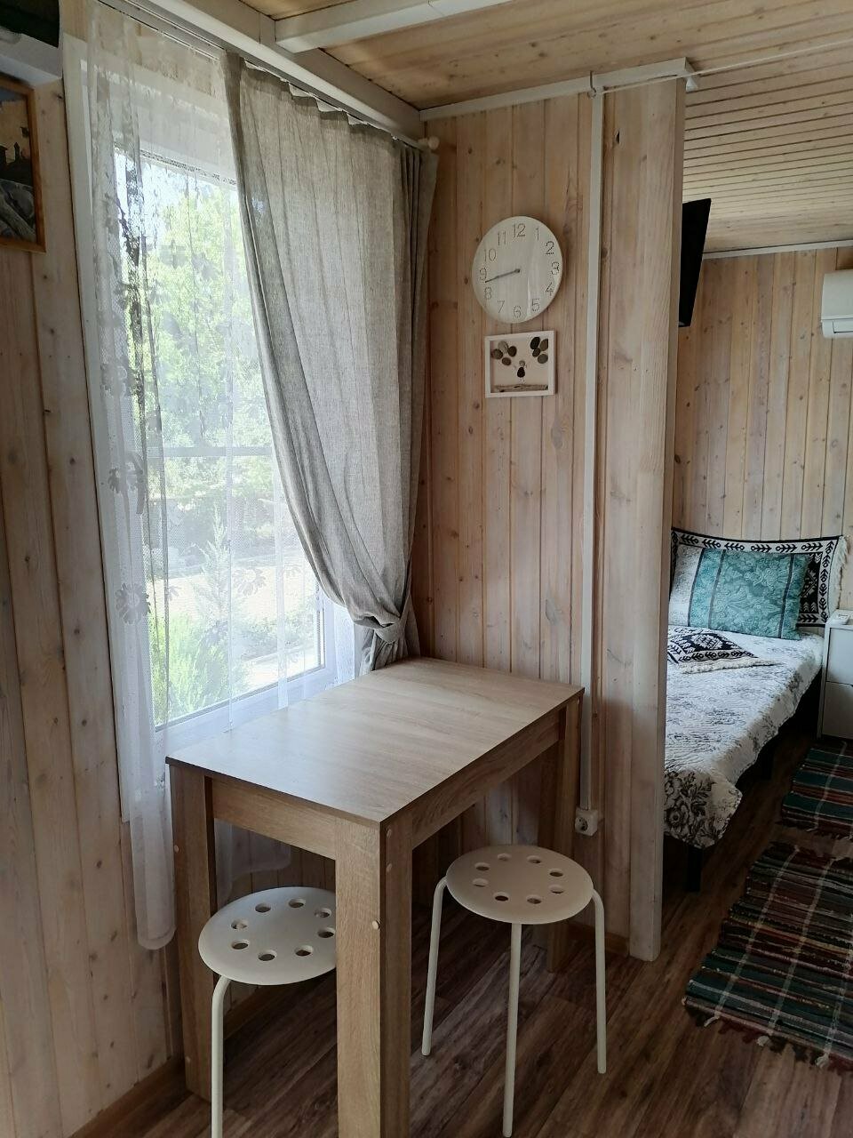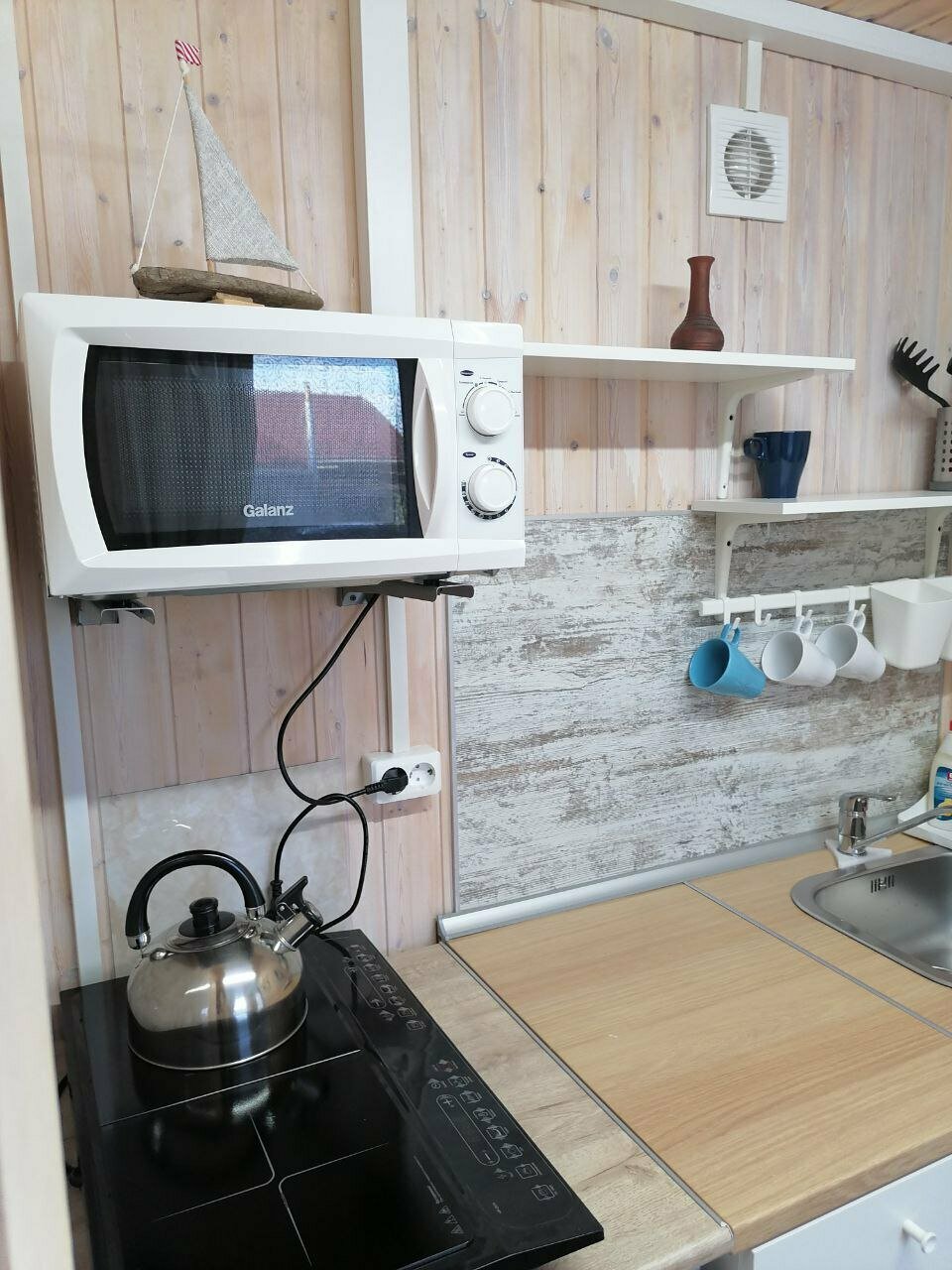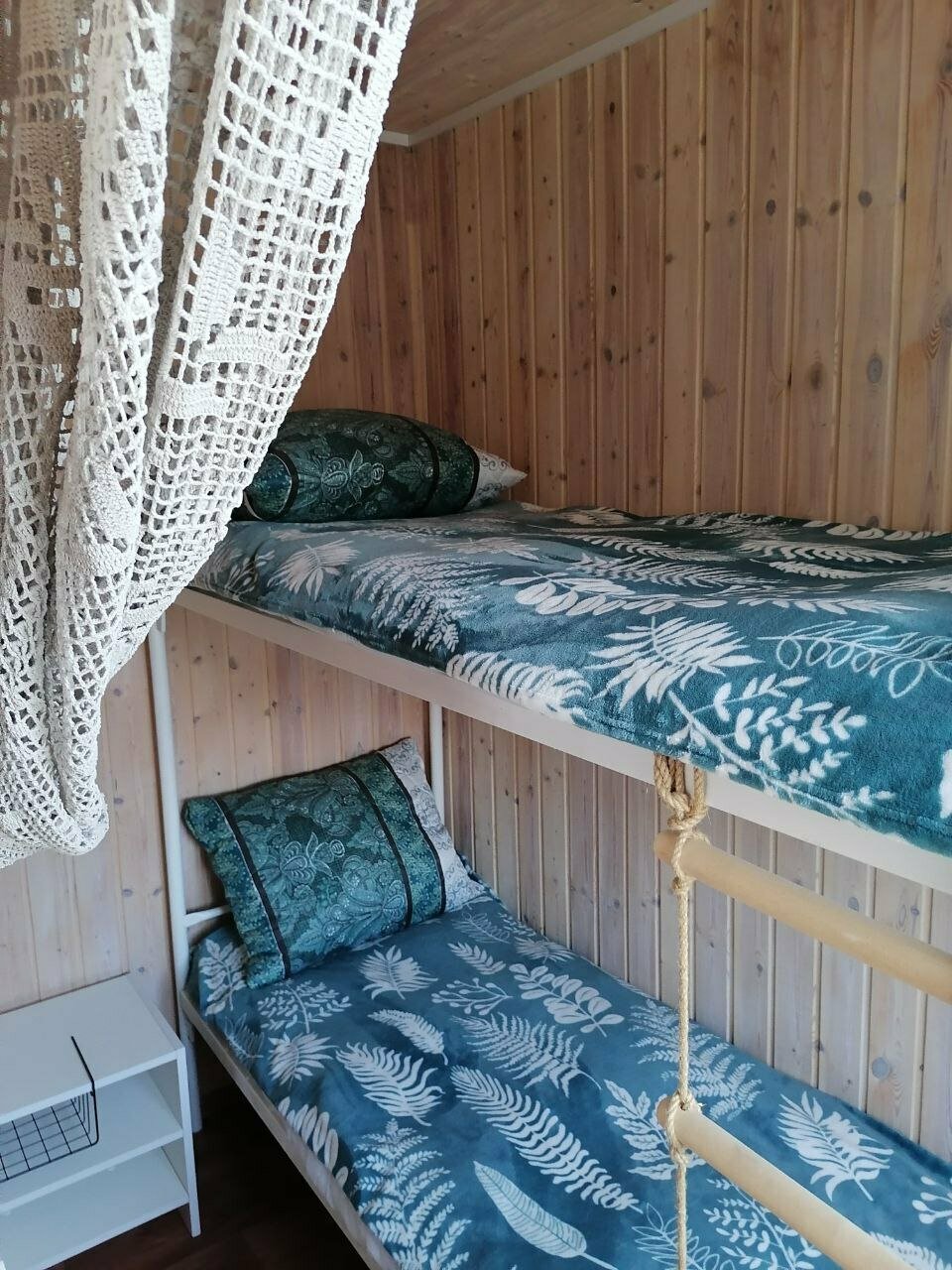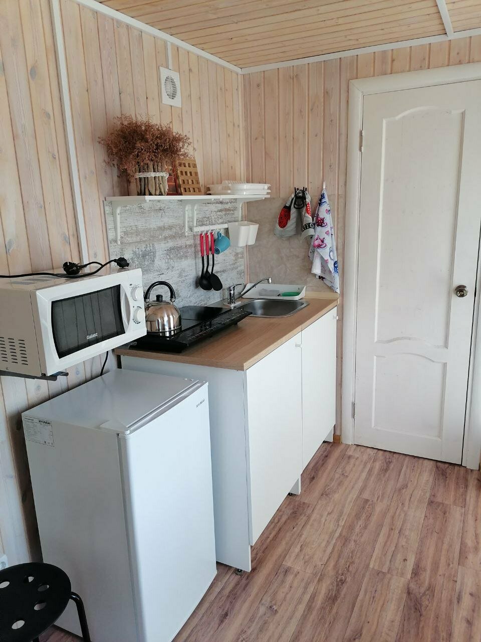 Домик имеет две спальни: в одной, две полуторные кровати, которые можно сдвинуть вместе, во второй - двухярусная кровать. Санузел с душевой. Кухня: холодильник, индукционная плита, СВЧ, необходимая посуда. Тумбочка, платяная штанга, ТВ, кондиционе...