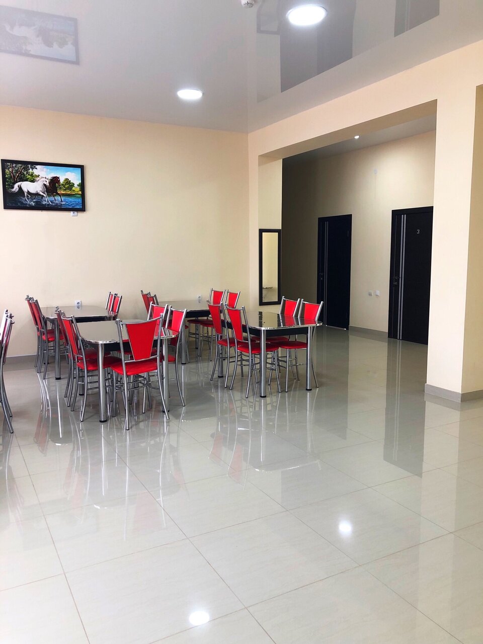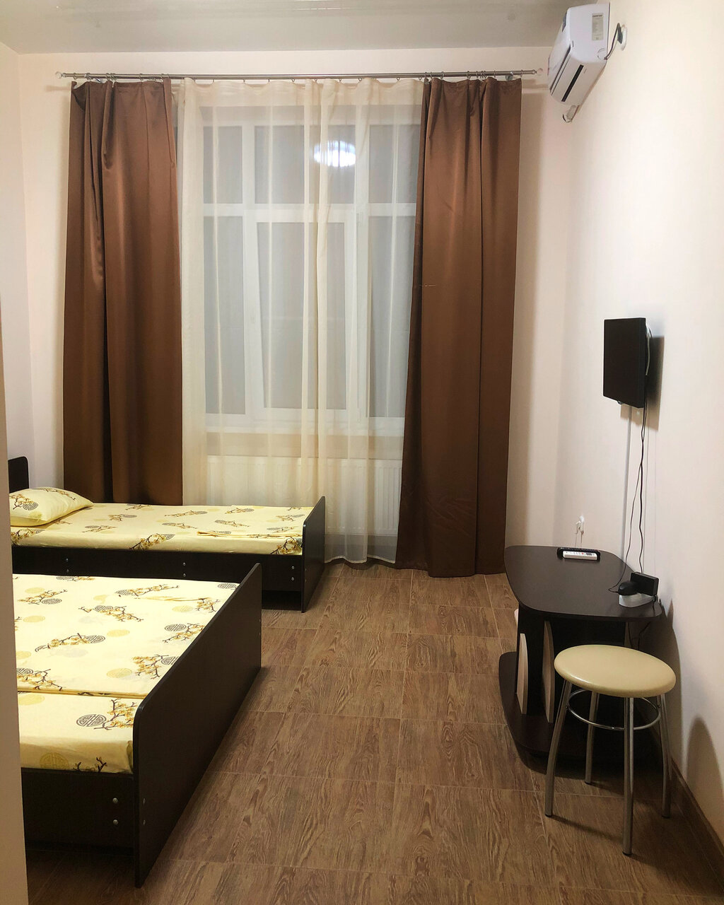 Номер большой, даже для пятерых вполне себе удобный. Мы такой и искали. Туалет, душ ,холодильник ,сплит система, шкаф, все есть. Вода горячая. В общей кухне есть 2 больших холодильника, микроволновая печь, плита,есть вся посуда,даже турка что немаловажно. Двор огромный, это очень удобно,дети катались на роликах, на скейте, целая площадка. Море в 5 минутах. Вещи тоже постирать можно,дополнительно и дешевле,сравнительно с другими отелями. На территории есть батут, песочница и игрушечный транспорт для игры деток :машинки, самокат. Персонал очень отзывчивый, помог нам очень, да по любому вопросу готов помочь. Спасибо за чистоту и за тепло! Обязательно приедем к вам снова!