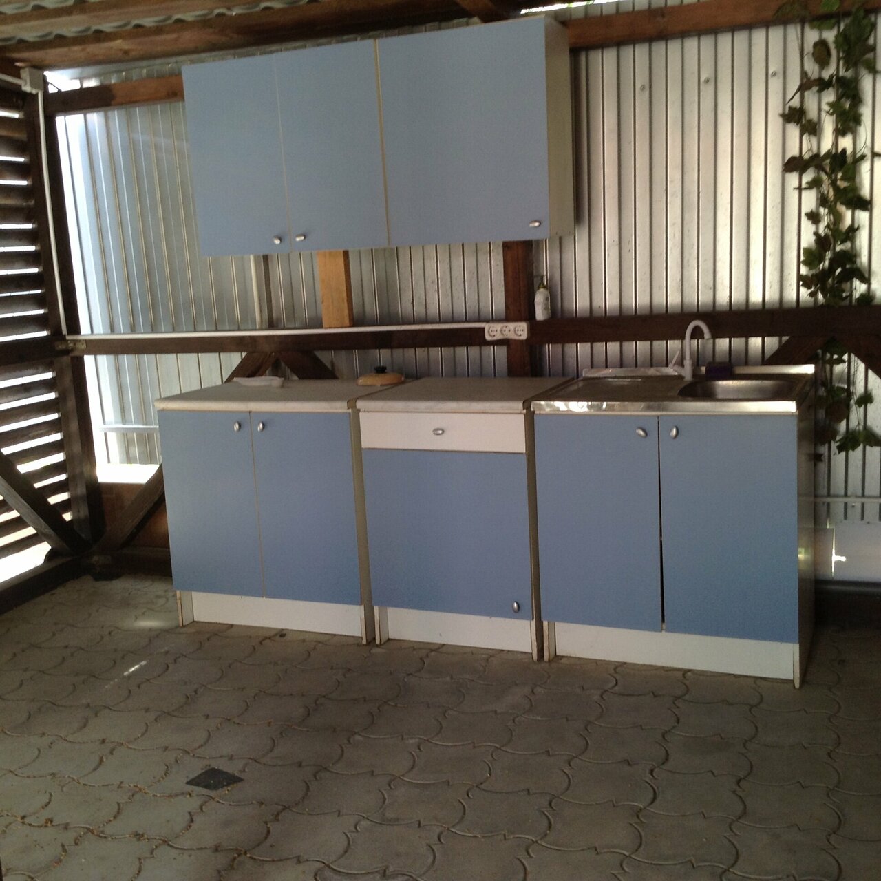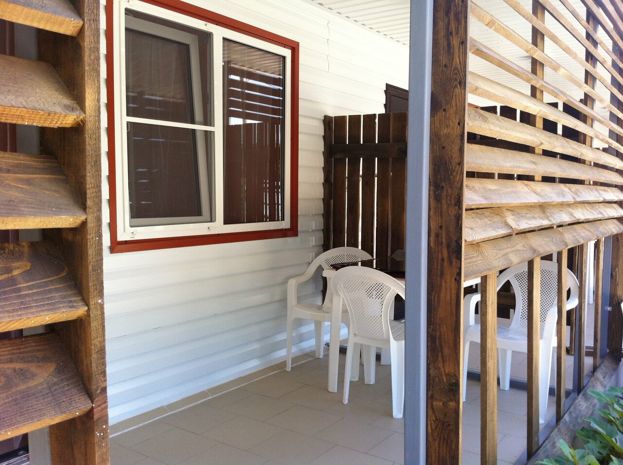 Номер со всеми удобствами с беседкой на которой стол ,стулья ,сушилка для белья. В номере двухспальная кровать,односпальная кровать и диван.Также имеется шкаф,комод,тв,сплит система,холодильник,душевая,унитаз,раклвина