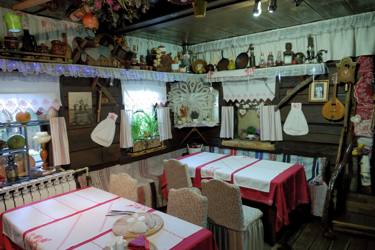 Очень интересное место! Выполнено ввиде старой сельской усадьды, печка, скрипящие полы, деревенская утварь придают этому месту какое то неописуемое очарование! В кафе очень вкусное меню, попробовали немного, но всё было на высшем уровне. Цены для кого как, впрочем как и везде. Было интересно посетить это место. Жаль рано утром надо было уезжать, многое не посмотрели!