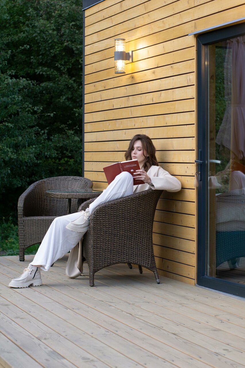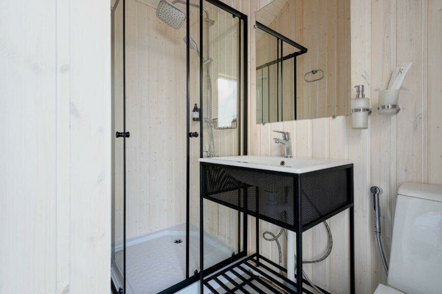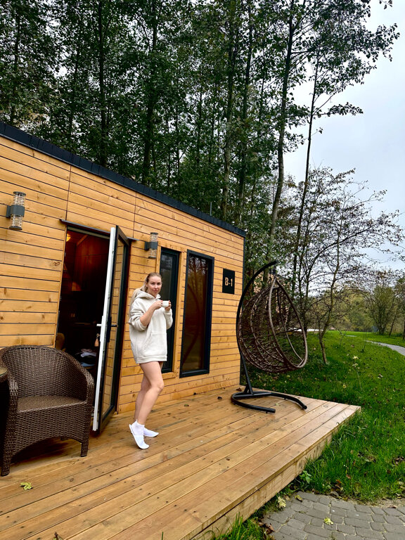 Уютный домик с собственной террасой и всеми удобствами внутри.В модуле тепло зимой и комфортно летом.На террасе располагается комфортабельное кресло-кокон.В санузлах - набор полотенец и гигиенические принадлежности.