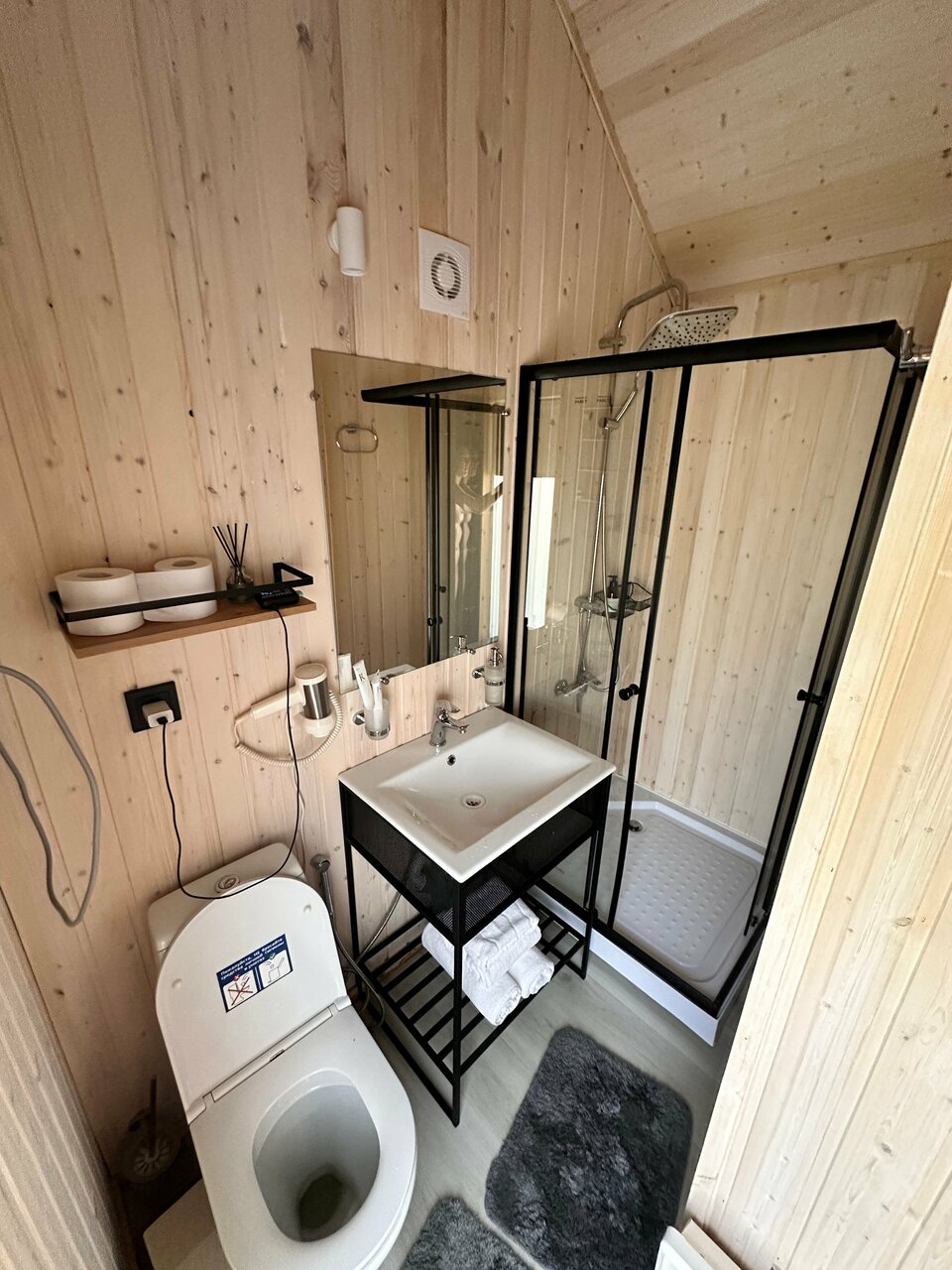 Уютный домик с собственной террасой и всеми удобствами внутри.В модуле тепло зимой и комфортно летом.Наши кровати имеют ортопедические матрасы для полноценного комфортного отдыха.В санузлах - набор полотенец и гигиенические принадлежности.
