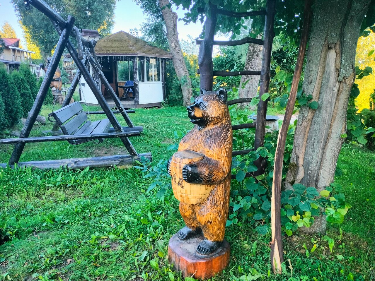 Неплохое место для ночлега, территория очень удачно расположена, много красивых видов и интересных занятий. Не понравилось только с эстетической точки зрения. Как будто хутору не хватает женской руки — везде какой-то беспорядок во всем, скульптуры и лавки по территории расставлены самым случайным образом, внутри домика предметы между собой не сочетаются. Какое-то дурацкое белье с рисунками, шторки родом из 2007 года, мебель старенькая, кое-где с пятнами. Вроде бы в 2024 году секреты дизайна интерьера перестали быть секретами — все есть в интернете. Верю, что это можно исправить очень недорого, было бы желание)