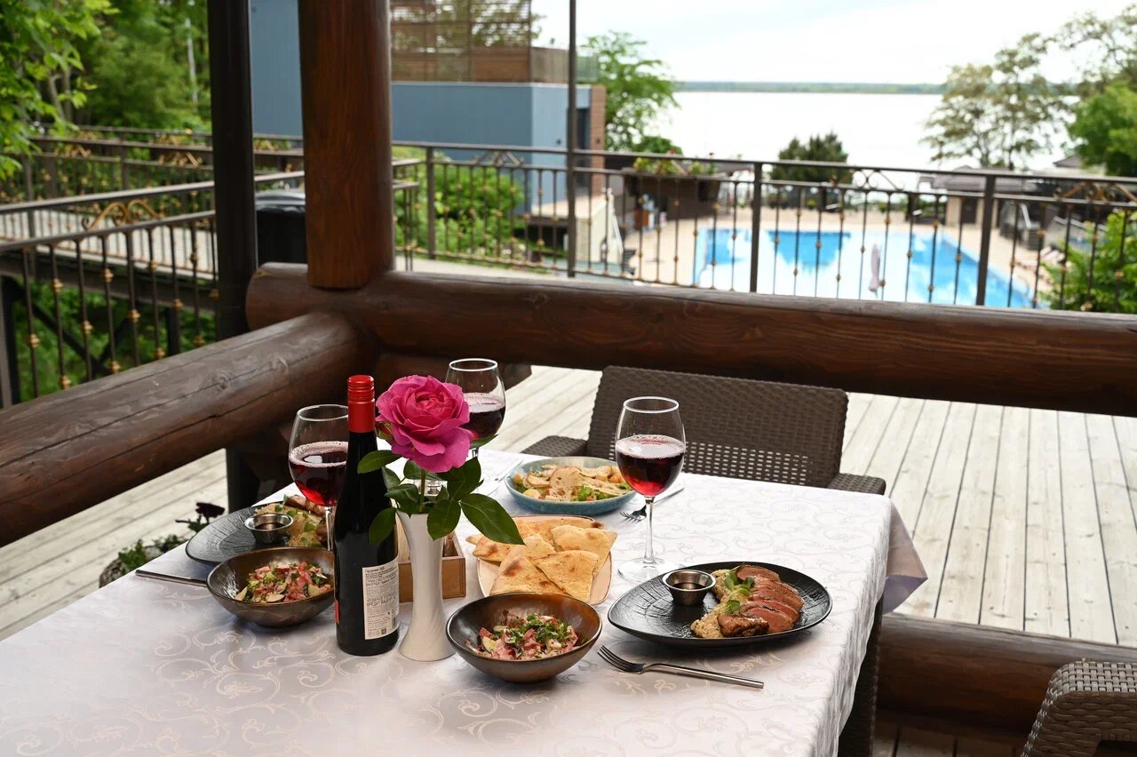 Удобное расположение на берегу водохранилища,зелёная зона,бассейн для детей и взрослых.Приветливый и дружелюбный персонал.Комфортабельные домики разных категорий.Завтрак разнообразный,включен в оплату проживания.Мангальная зона,беседки на территории,летний и зимний рестораны.Несколько портит комфортный отдых соседство с базой ‘Энергетик’- громкая ‘забойная’музыка и прочее….
