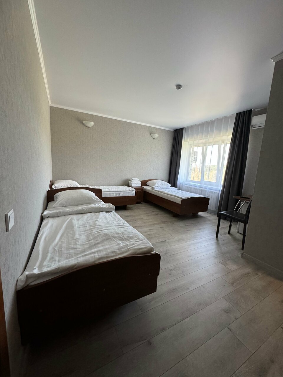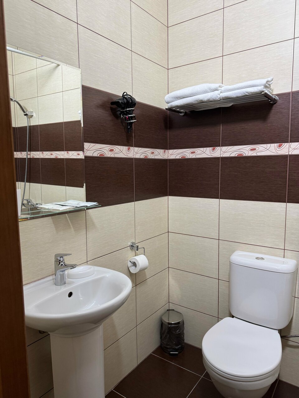 Хорошая гостиница для остановки на ночь. Ехали из Питера в Анапу с тремя детьми. В номере разместились, все есть-холодильник, телевизор, фен, зубная щетка с пастой, гель для душа, шампунь. В номере и в ванной комнате чисто. Постельное и полотенца чистые. Вечером спустились покушать в их ресторан.заказали борщ, пельмени, цезарь, картошку с грибами — все было очень вкусно, порции достойные. Завтраки у них с 8, но мы выезжали рано и попросили нам разогреть заказанный накануне завтрак. Фаршированные Блины, сырники были невкусными. В остальном хорошее место для ночевки по пути на юг.