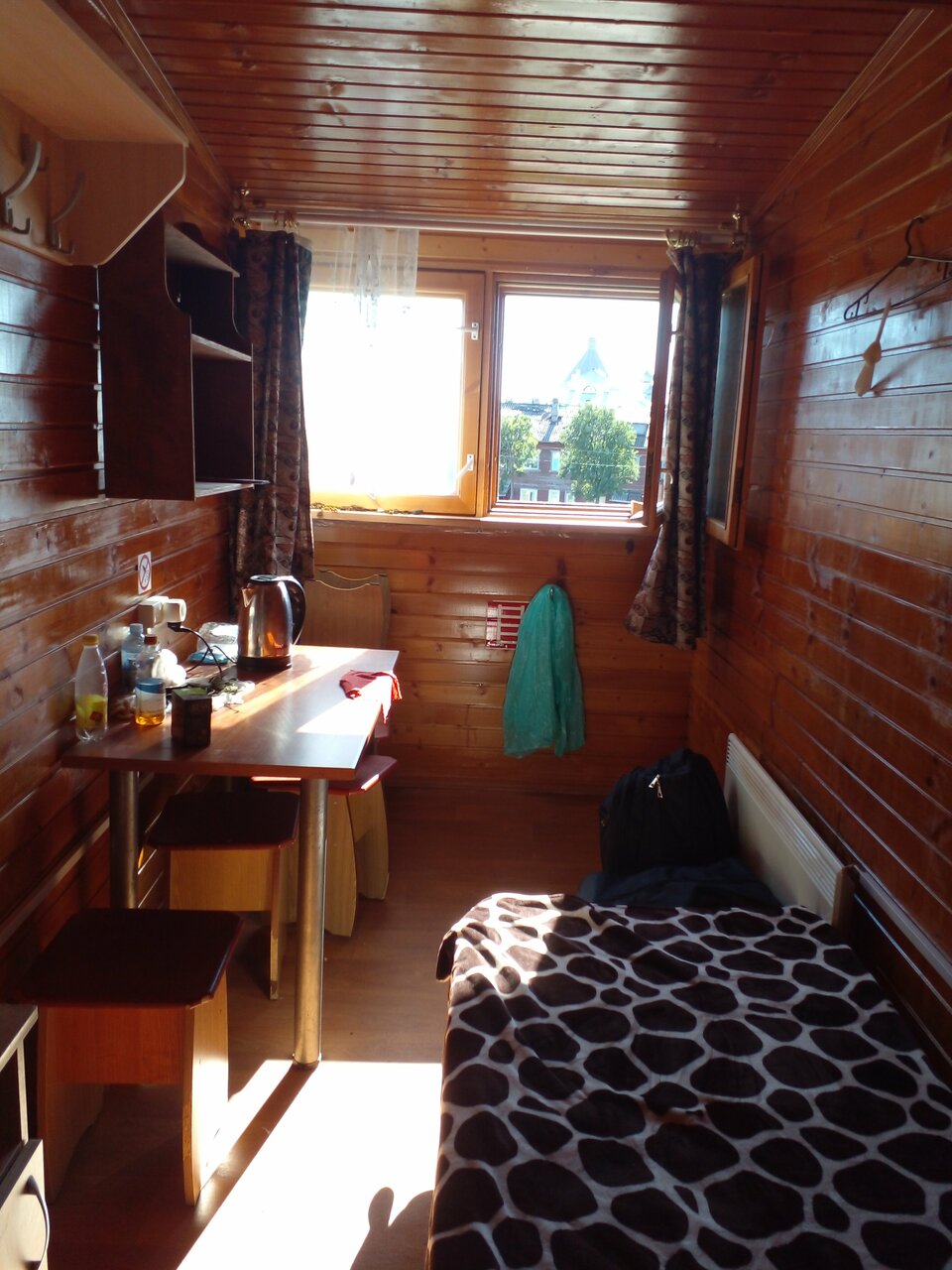 Очень приличная гостиница данной ценовой категории. Целиком деревянная изнутри. В 11-местном номере, где расположилась наша группа, 5 сдвоенных двухэтажных спальных мест, 11-тое одинокое. Удобные матрацы, белоснежное, хорошо отглаженное постельное бельё, но без полотенец. Тёплое лёгкое одеяло. Туалет и душ на этаже, с горячей и очень мягкой водой. В комнатах иконы, на тумбочках Евангелие, молитвослов, на этаже есть молельная комната, есть где по трапезничать, электрочайники тоже есть. Из минусов: наверху кто-то в одну из ночей с 5-ти утра двигал мебель, делал шумную уборку. Из бонусов увиденное северное сияние. Администратор одета в наряд Архангельской области с добрым нравом. Рядом с гостиницей купель, работающая с 17 до 20 часов. На втором мансардном этаже двухместные номера на 200 р. дороже, но с низкими неудобными потолками.