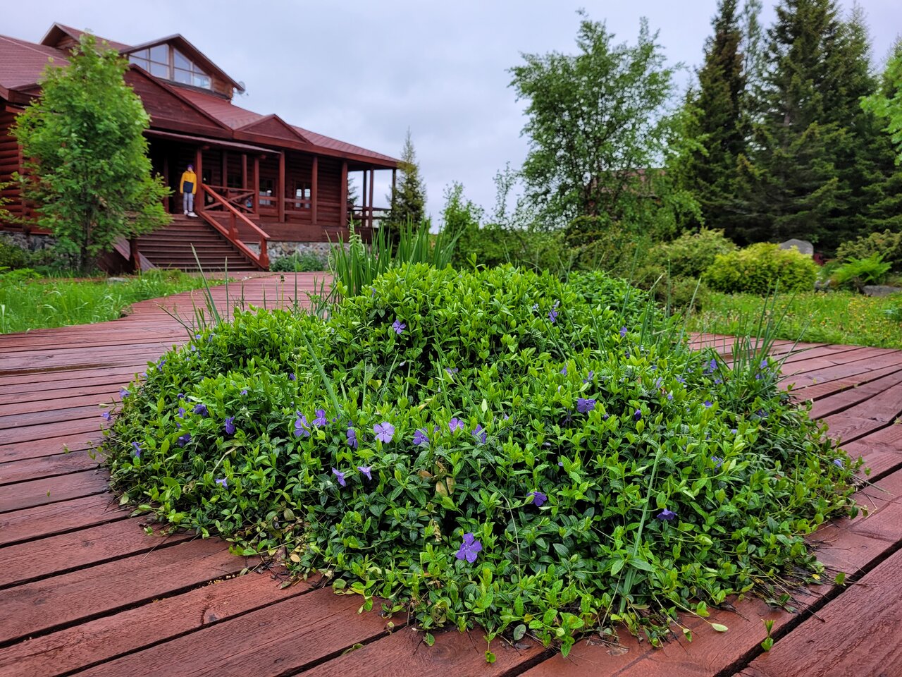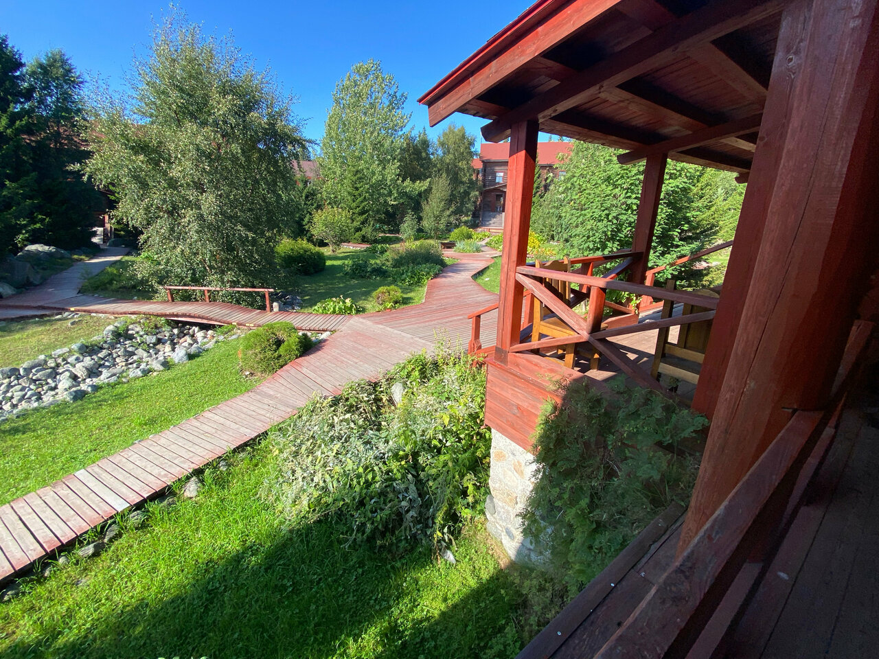 - Благоустроенная территория с интересными растениями.