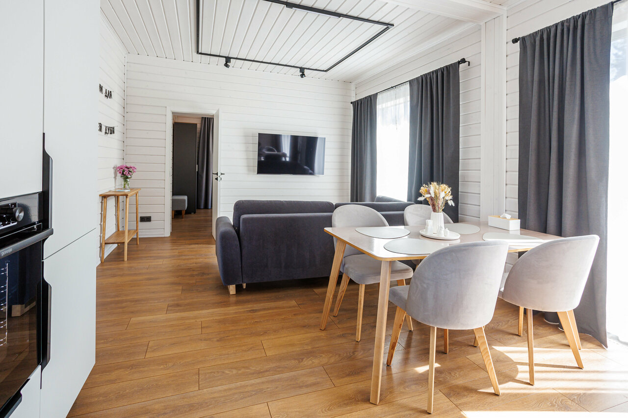 Современный дом комфорт класса граничащий с лесом.В доме есть все для комфортного отдыха.Дом с двумя спальнями, в котором с комфортом могут разместиться 4 гостя. При необходимости возможно размещение 2 дополнительных гостей на раскладном диване.