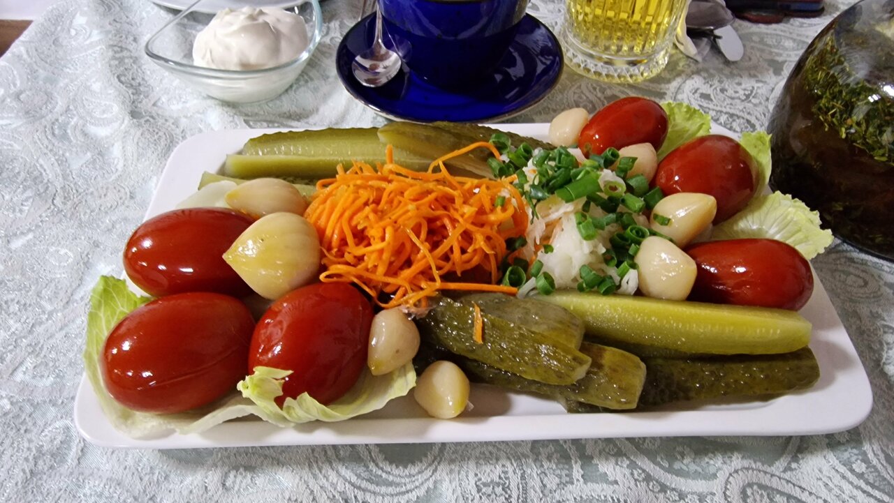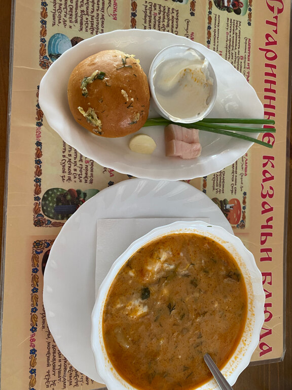 Была с семьей из 4 человек.Дети маленькие едят плохо заказали по половины порции горячего,подали в больших тарелках щи с ними шли на отдельных тарелках сметана,сало,чеснок,гренки,что не могло не радовать.еще в закаще ьыл рис с овощами очень понравился,рыба в кляре и манты.всё было вкусное и по приемлемой цене.советую
