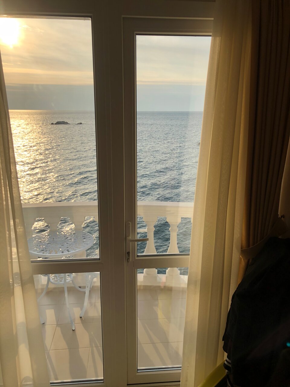 Крутой вид с террасы люкса. Прекрасно провели время с друзьями за курением кальяна. Отель на первой линии, море рядом. Завтракали и ужинали в ресторанах санта барбара и лотос. Днем ездили на экскурсии по Южному берегу крыма. Парковка платная 300р в сутки. С точки зрения логистики и изучения полуострова — удачное место.