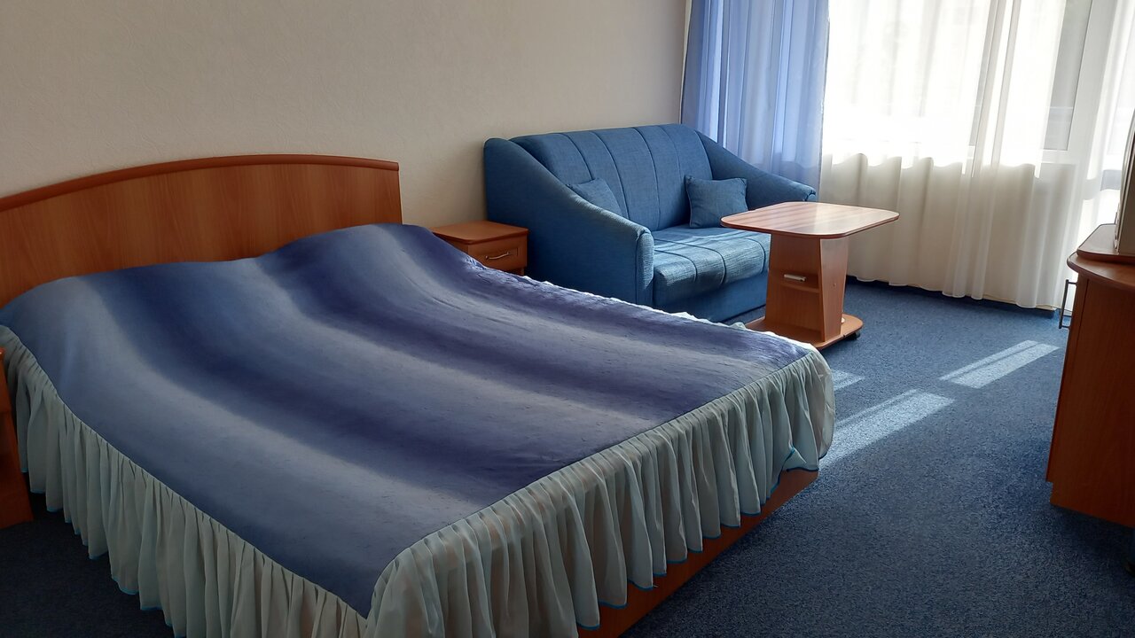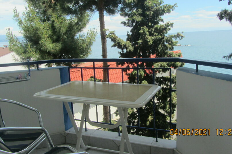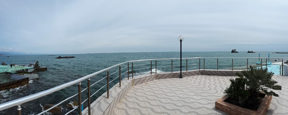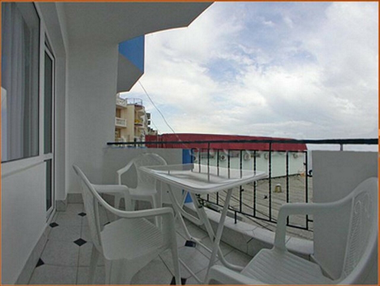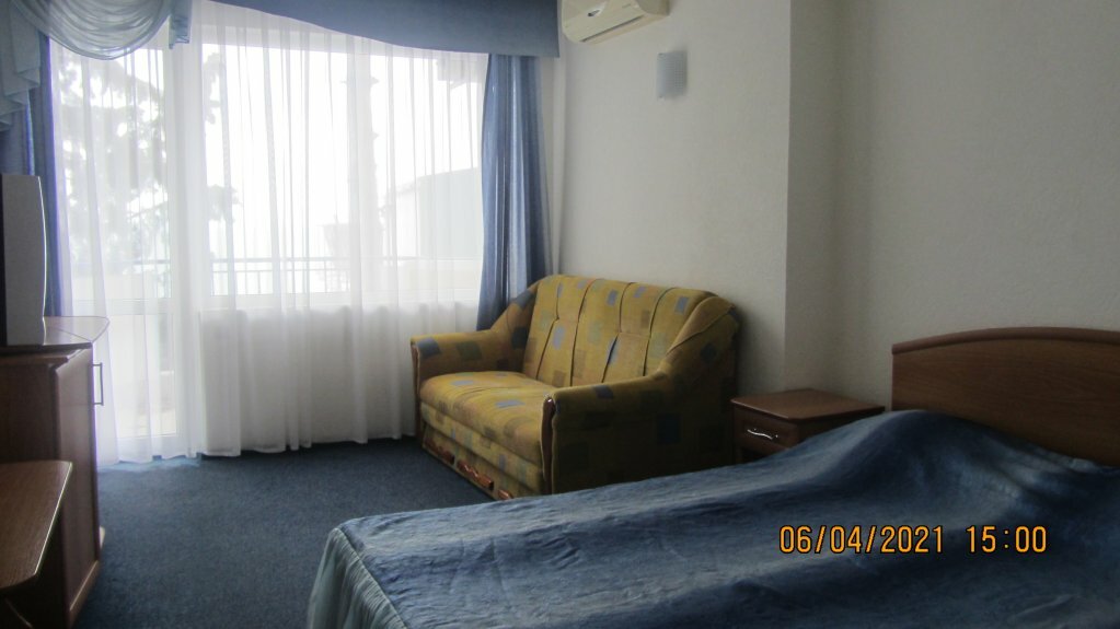 Дали номер с видом на море. Есть балкон со столиком и 2 креслами. Тв и удобная кровать. За такие деньги 1500 р — лучше ничего нет. Магазины и кафе рядом, до моря 2 минуты пешком