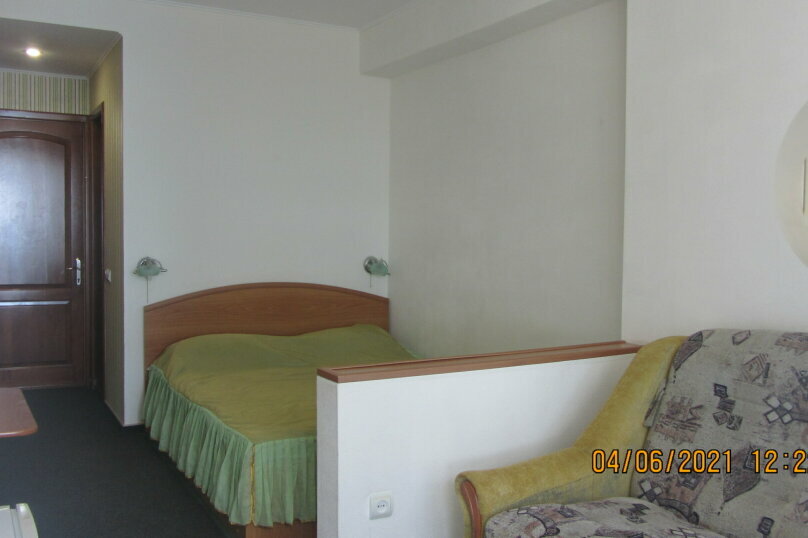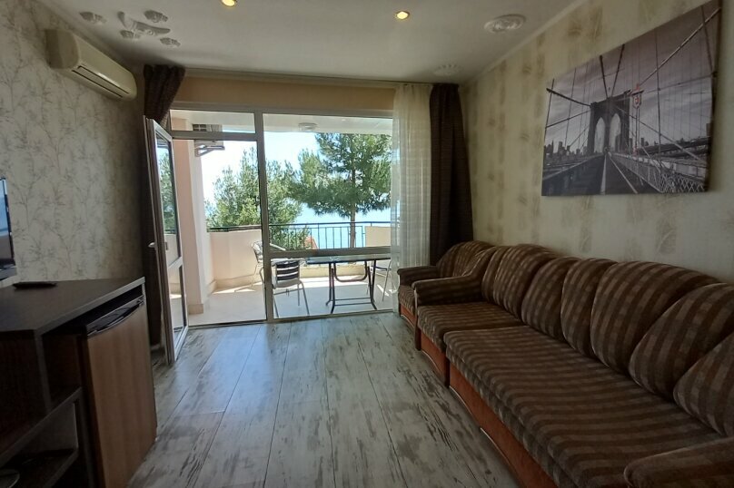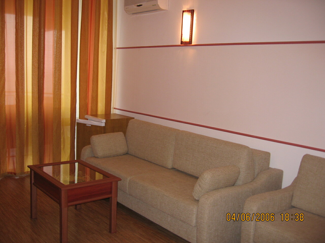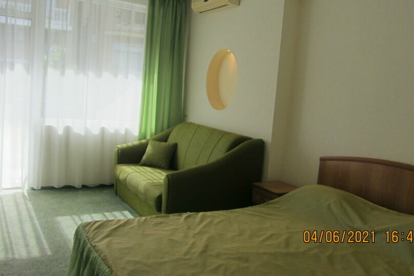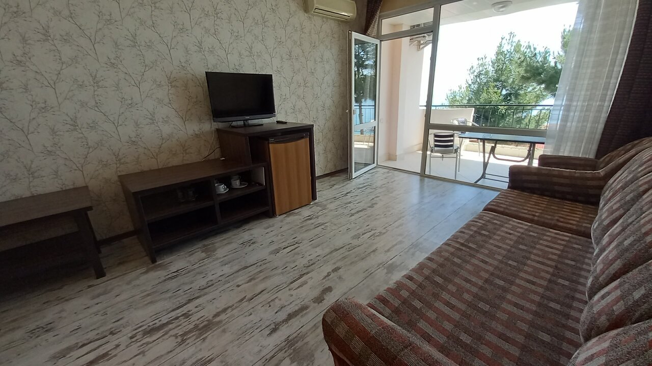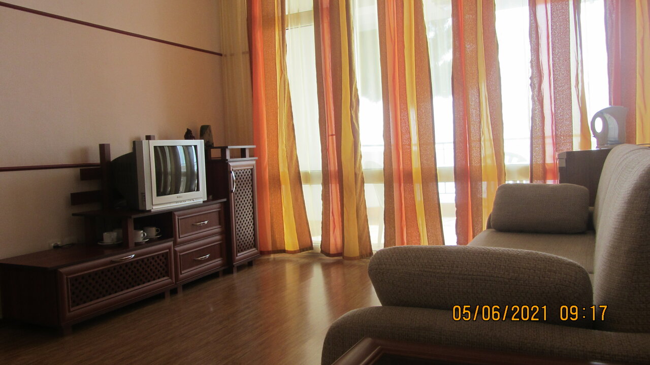 Дали номер с видом на море. Есть балкон со столиком и 2 креслами. Тв и удобная кровать. За такие деньги 1500 р — лучше ничего нет. Магазины и кафе рядом, до моря 2 минуты пешком