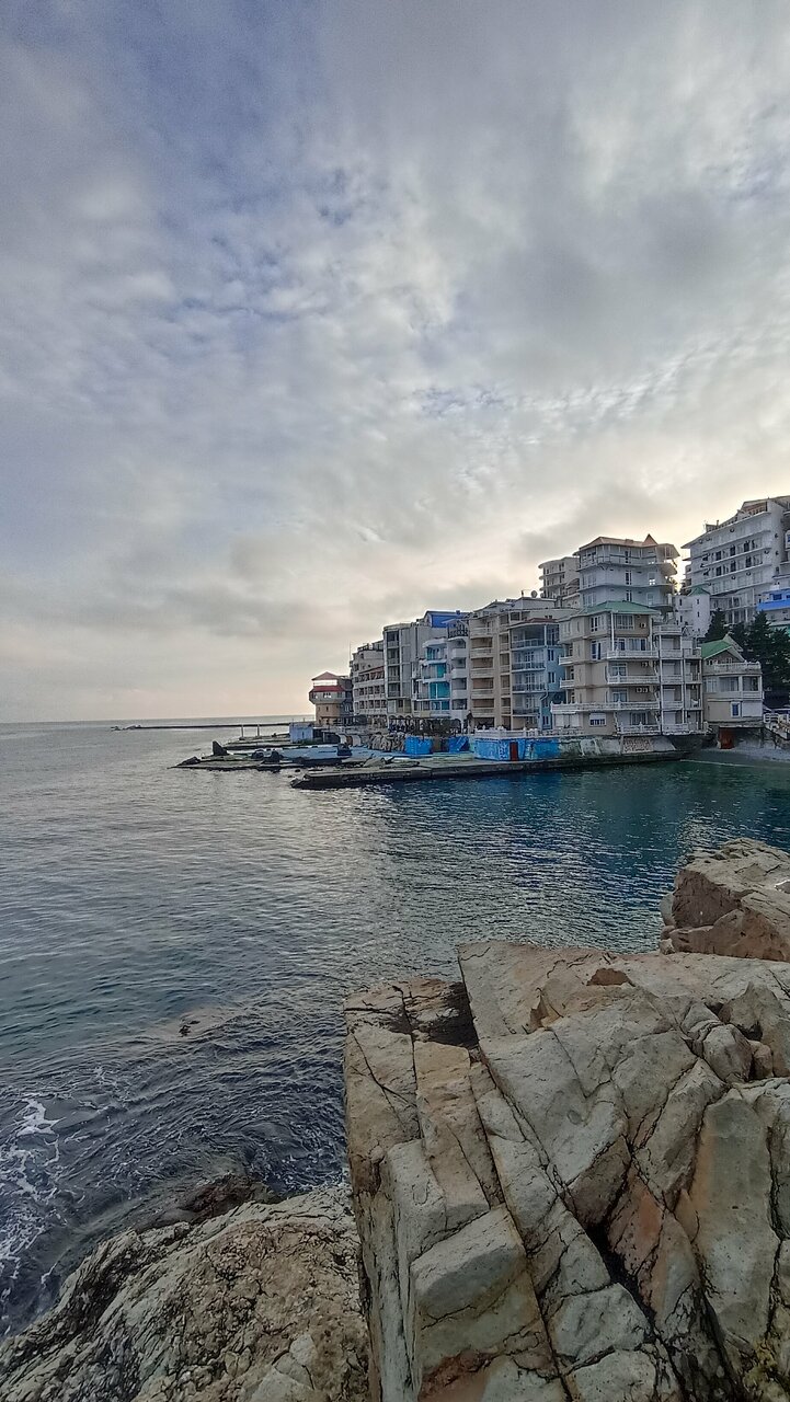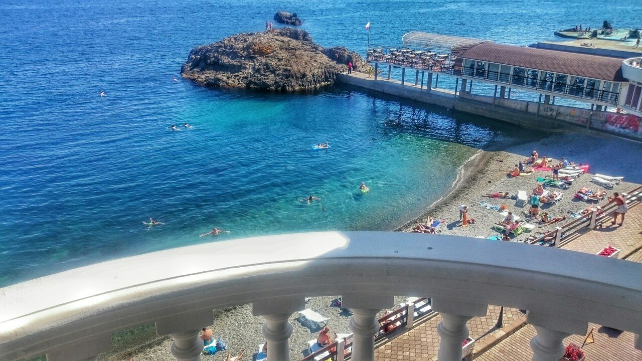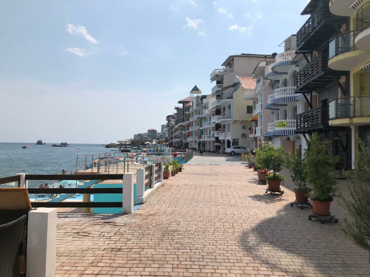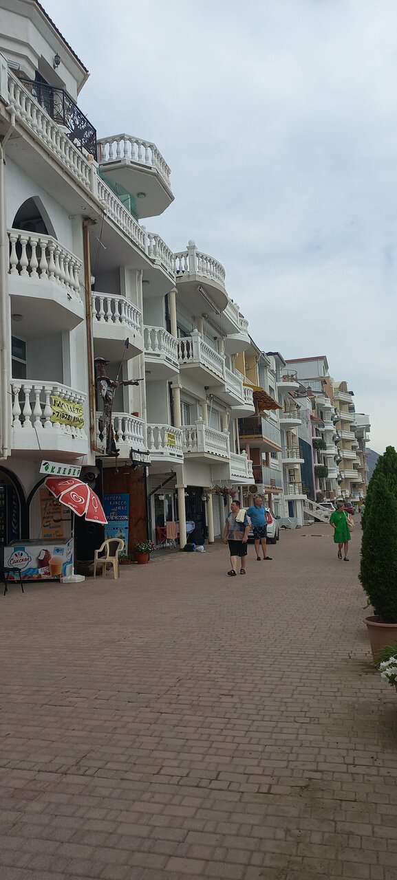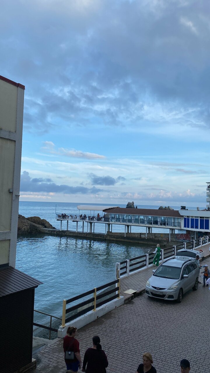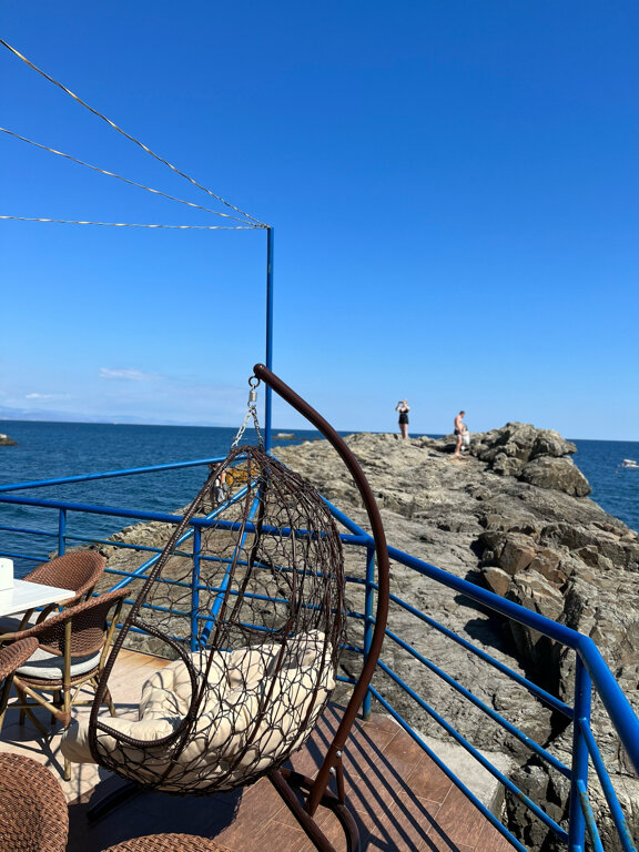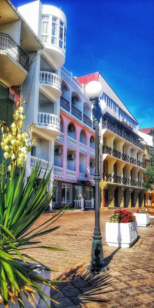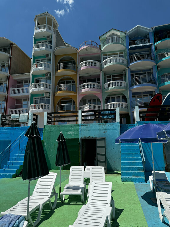Вид с балкона нашего номера — это самое заветное желание любого отпускника! Море, море, море и всё! На балконе качелька плетёная, столик. Это идеальное место для романтика на уикэнд. Формат посёлка я не поняла. Похож на гаражный кооператив 80х годов, который в силу современных тенденции перерос в десятки отелей-столбиков. Да и сильно напрягает движение авто по крохотный набережной, где все гуляют. Отель рекомендую для романтичных вечеров, винишка на балконе и созерцания моря. Но, на 2-3дня.