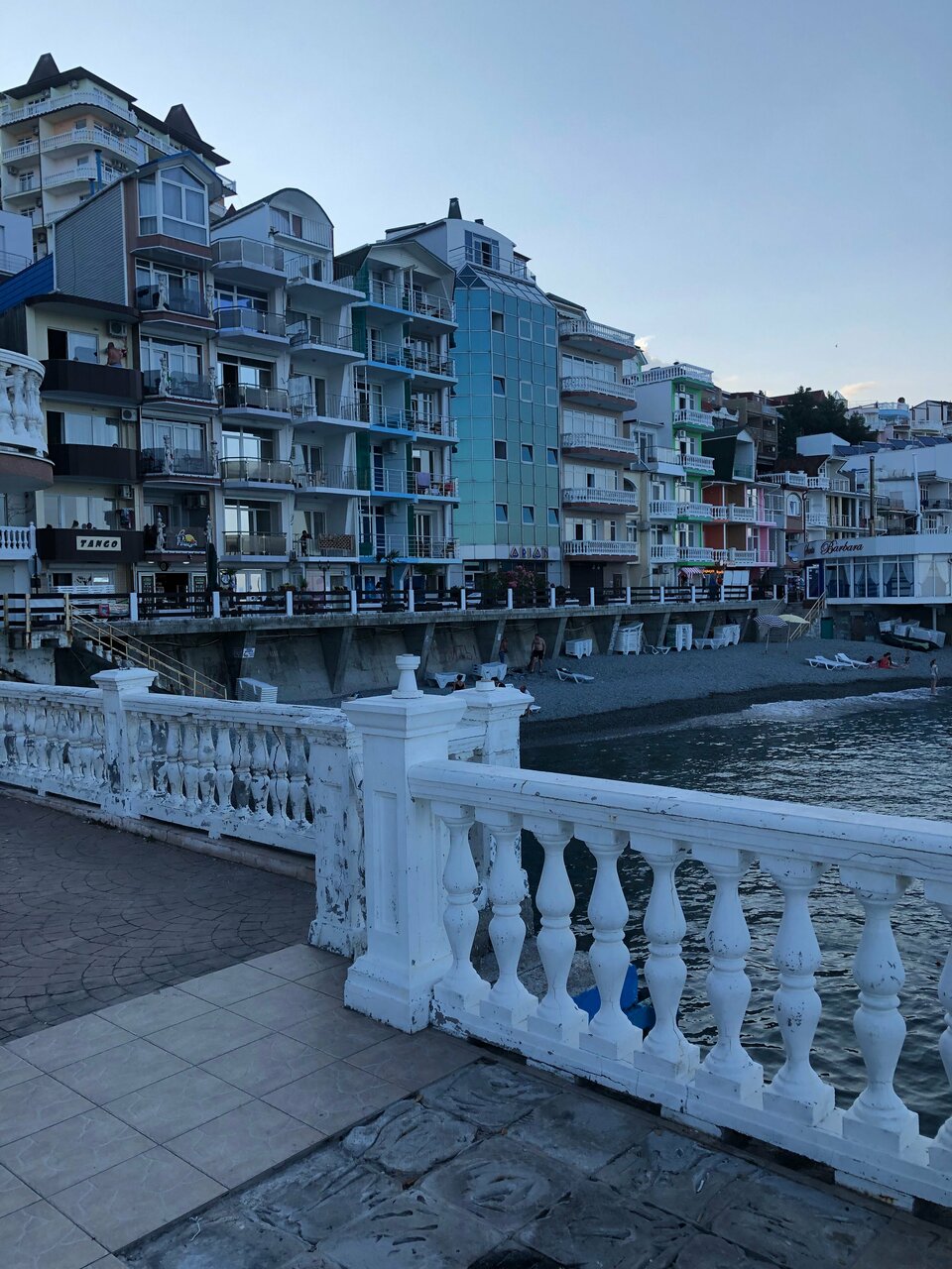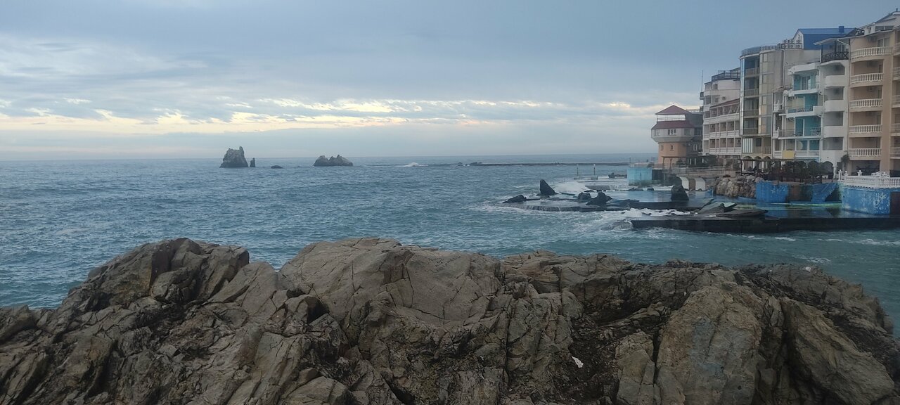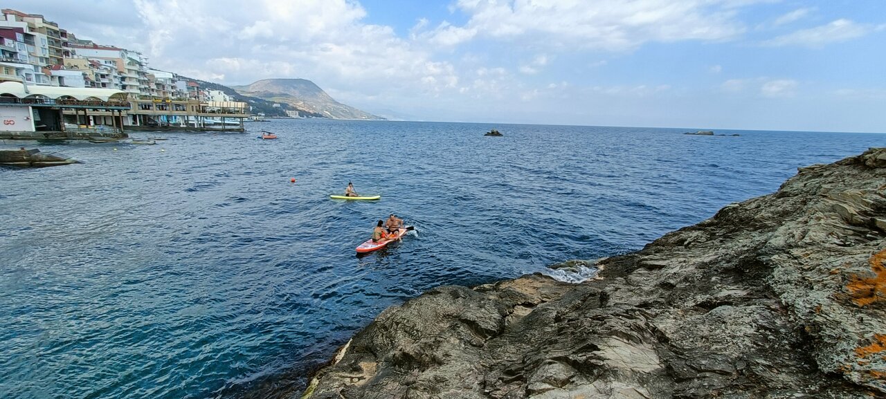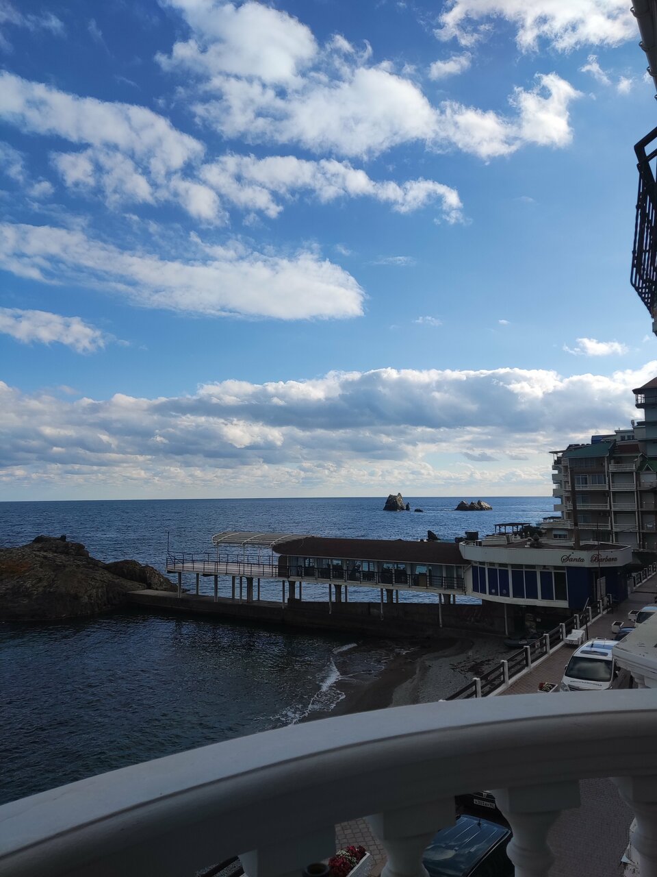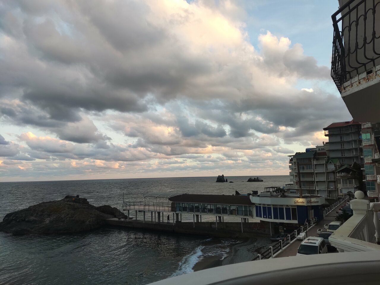 Отдыхали во втором корпусе гостиницы Санта-Барбара. Номер с видом на море-очень красиво. На первом этаже гостиницы есть столовая, цены приемлемые, вкусно. В самом посёлке Утес спокойно, набережная небольшая, но уютная. Из минусов — лежаки на пляже для 2 корпуса платные.