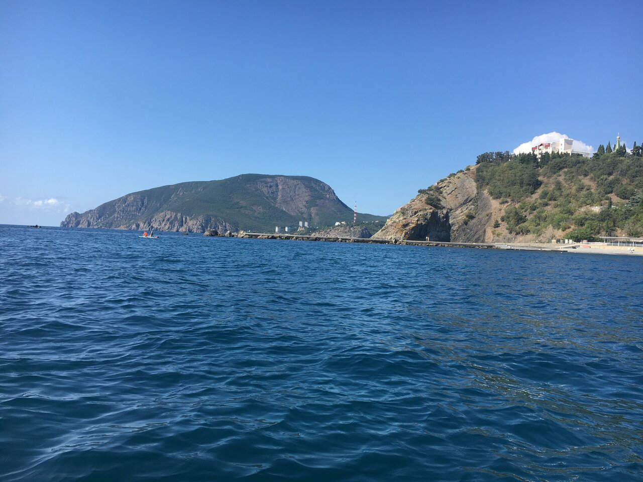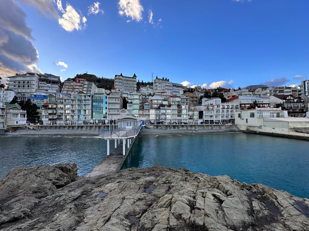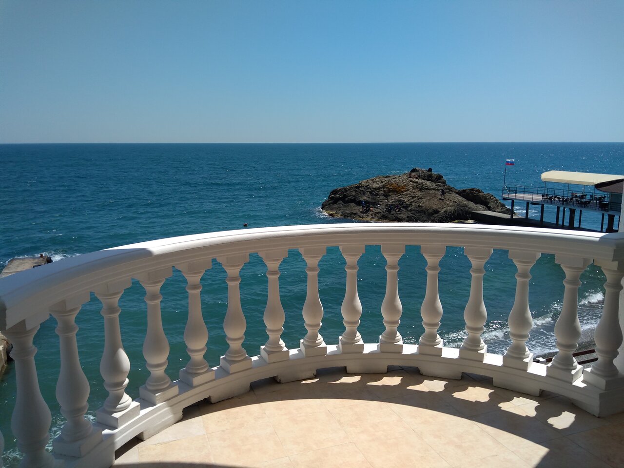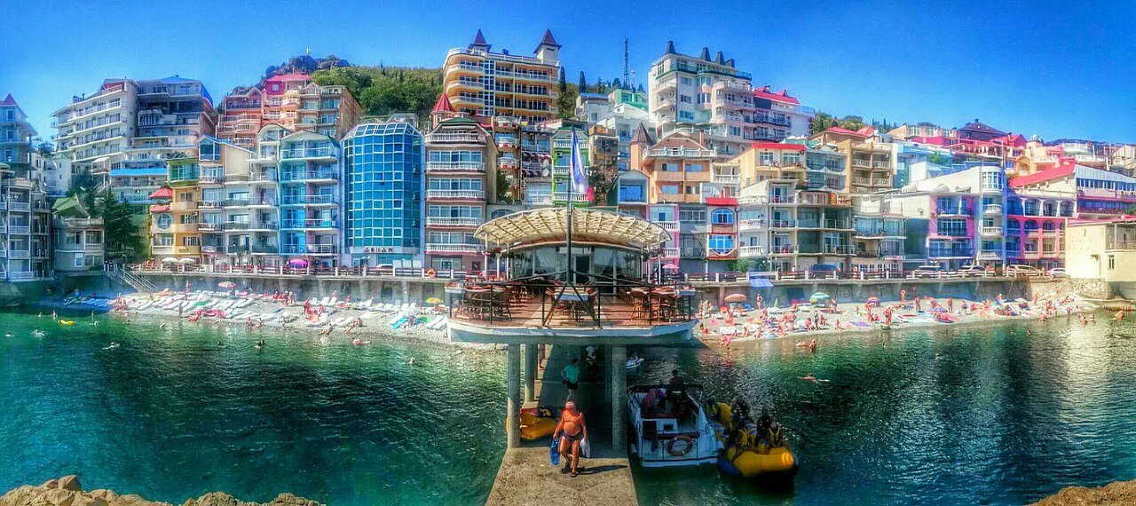 Отдыхали во втором корпусе гостиницы Санта-Барбара. Номер с видом на море-очень красиво. На первом этаже гостиницы есть столовая, цены приемлемые, вкусно. В самом посёлке Утес спокойно, набережная небольшая, но уютная. Из минусов — лежаки на пляже для 2 корпуса платные.