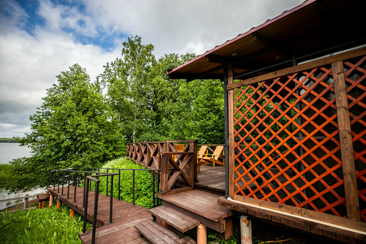 - Чистота и ухоженность территории.; Наличие питьевой воды в доме.; Вежливый и отзывчивый персонал.; Вид на озеро, возможность рыбалки.; Уединённость домиков (каждый со своей территорией).