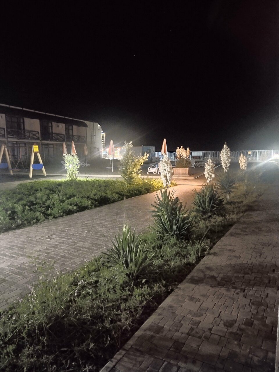 Это волшебное место. Своя территория, на пляж и с пляжа только через чип. Возможно не хватает развлечений для детей (в наличии маленький комплекс с горкой и 2 качели). Бассейн отличный! Подогревается от солнца. Есть маленькие нюансы по оснащению апартаментов. Но это уже вопросы лично к владельцам. А так все супер. В 5 минутах ходьбы центровое место с кафе. Через забор Соленое грязевое озеро. Центральный пляж справа от комплекса. В наличии лежаки (стоимость не знаю), сапборды (1000 рублей/час), качели в море (100 рублей 15 минут). Но много битых ракушек , мне не понравилось. Если вам нужен отдых вдали от суеты, шумных набережных, это то самое место!!!!