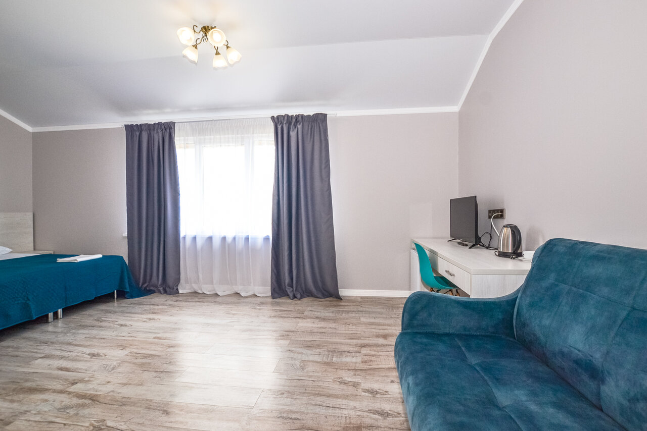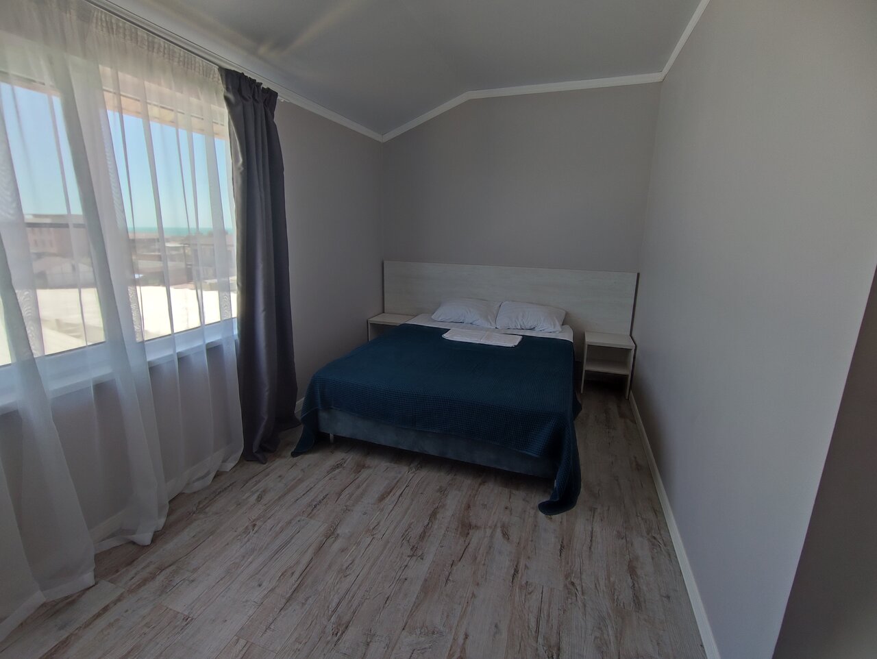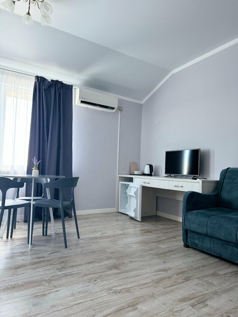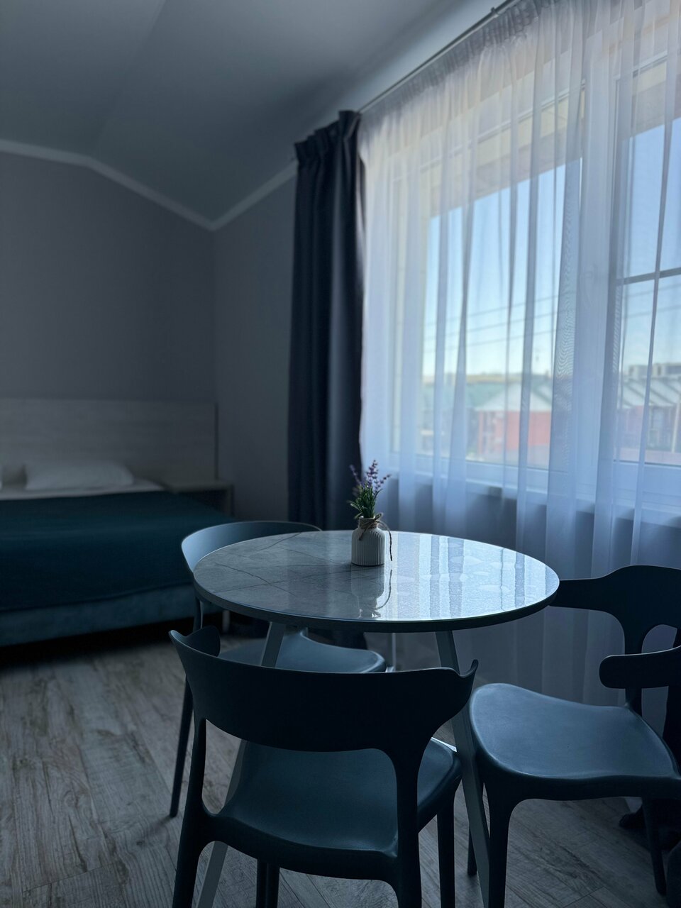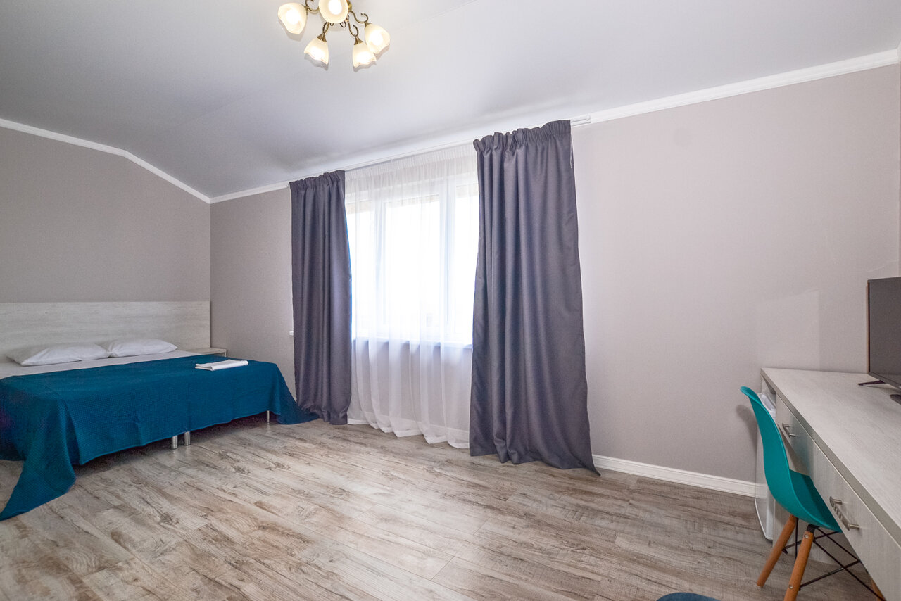 В номере было чисто, уютно, но не понимаю почему за такую цену не предусмотрена ежедневная влажная уборка. Жили в 9 номере, будьте готовы что с открытым окном спать вряд ли получится, под окнами дорога и парковка для посетителей ресторана, столовой и магазина, вообщем, шум от авто, хлопанье дверьми и разговоры будете слышать постоянно. В номере не хватало небольшого столика и стула. На территории бассейн ( не купалась, оценить не могу), игровая комната, для жителей гостиницы 300 руб день, детям понравилась, до моря недалеко, но и не рукой подать( мин 7 идти)
