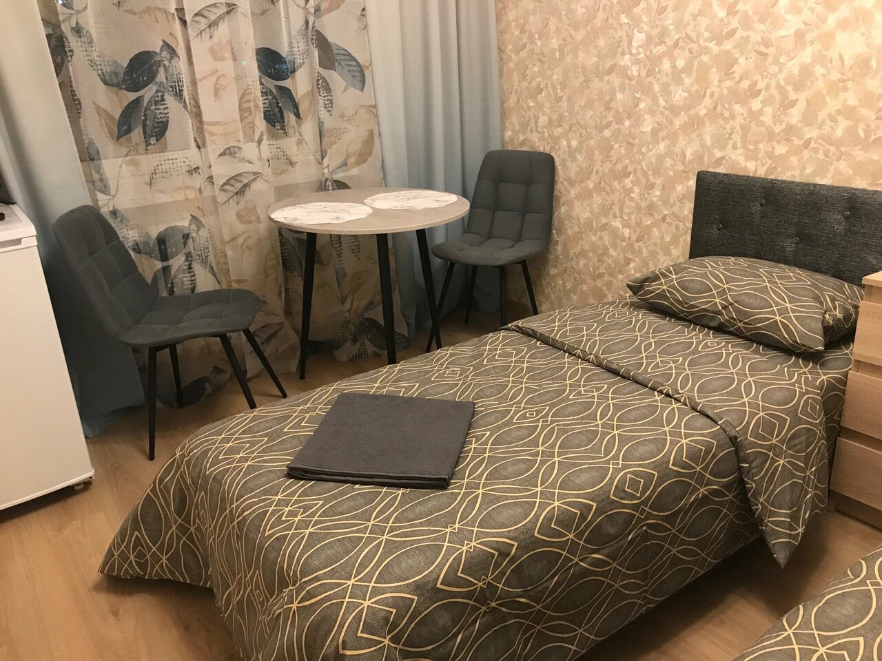 Двухместная комната в двухкомнатной квартире. Удобные кровати, шкаф для одежды, стол, стулья, телевизор, холодильник, чайник. Общая ванная, туалет, кухня.