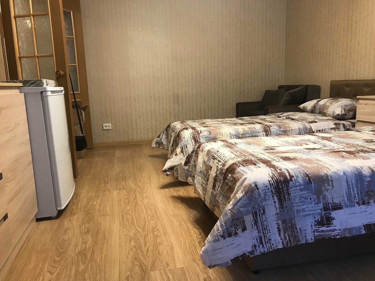Четырехместная комната с большой лоджией в двухкомнатной квартире. Удобный кровати, диваны, шкаф для одежды, комод, телевизор, холодильник, чайник. Общая ванная, туалет, кухня.