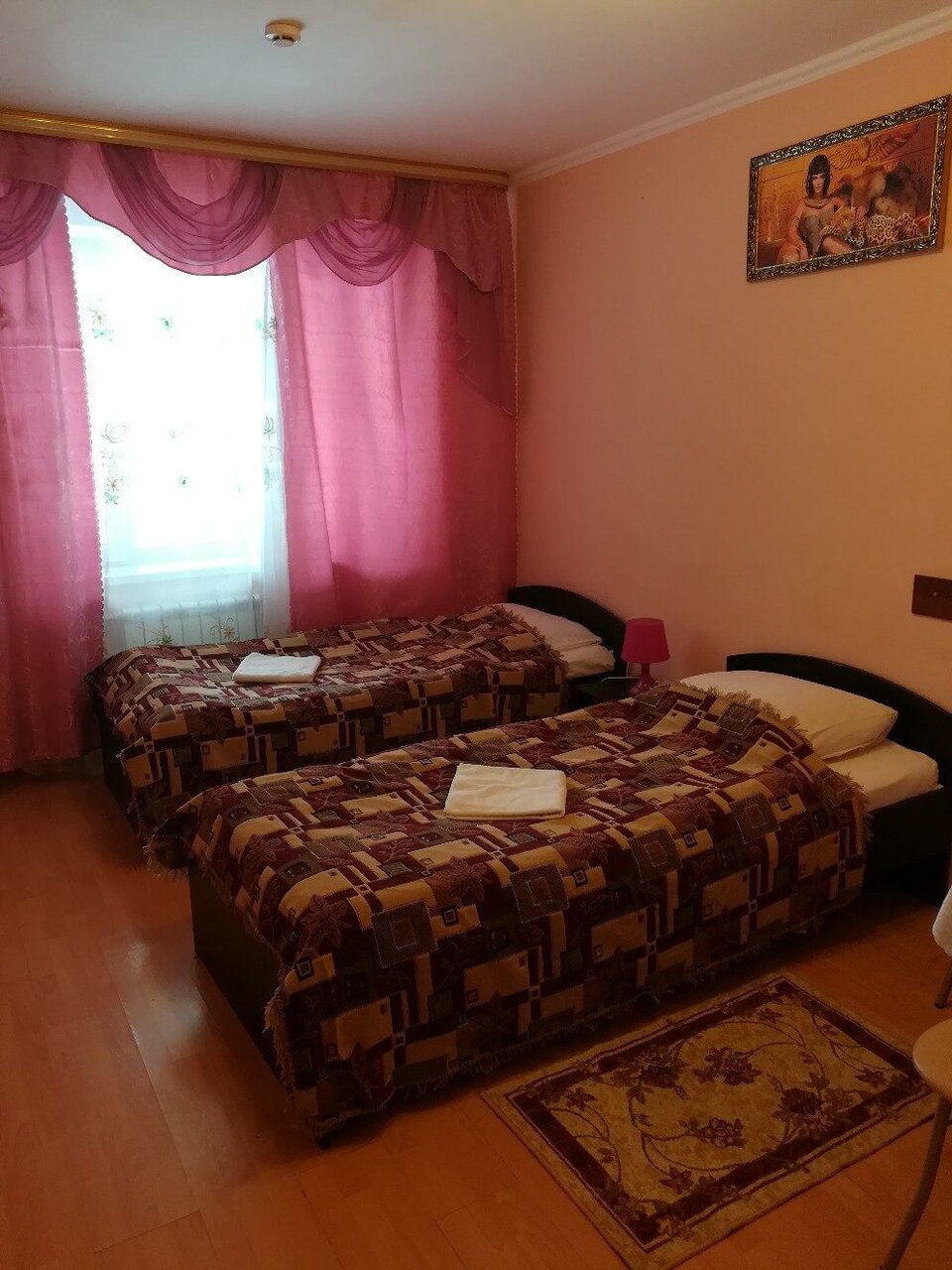 Парковки нет совсем, только платная (отдельно от гостиницы). Долго искали с мужем, находиться в многоэтажном доме (первый этаж хотел, второй гостиница). Администратора не было на месте, звонили по телефону, недовольно поднилась с нами и показала номер. В номере за 1700 :была двуспальная кровать (мягкая, два матрасца лежит, постельное вроде чистое, приличное). Туалет и душевая вместе, где очень неудобно подойти к раковине. С утра увидела ползучего таракана мелкого. На кровать прилегла и провалилась, спинка оказалась отломанной. Телевизор показывает 4 канала, на этаже общий холодильник (не знаем :рабочий или нет). В 5 утра сработала пожарная сигнализация, кричала минут 15, муж пошёл узнать в чем дело :в ответ не услышал извенения… Только упрекнула, что меньше курить в номере нужно… Хотя мы совсем не причём. Вообщем, дорогие люди — не рекомендуем мы вам это заведение… Не отдыха, не комфорта нет увы