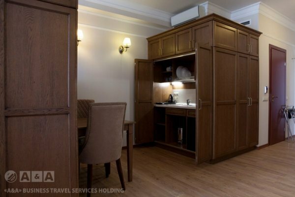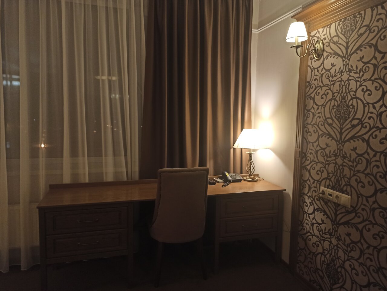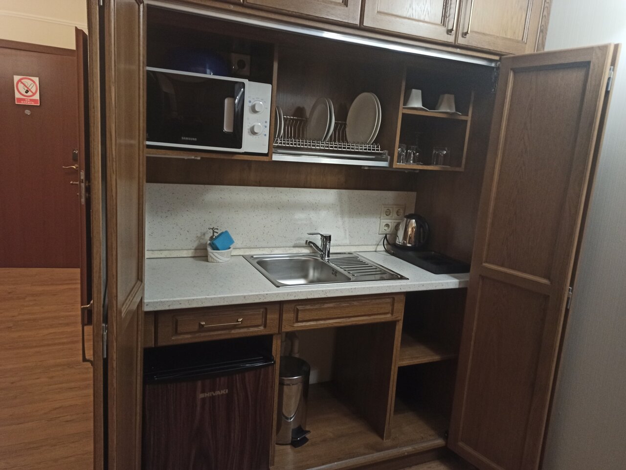 Остановились с семьей на сутки. Взяли полулюкс за 4500. Номер отличный, просторный, чистый. Порадовала кухня. Халаты, зубные щетки и т.д. Пара минусов всеже было. Был сломан электрочайник — сам не выключался и перегревалась паром кнопка отключения — жена обожгла палец до волдыря. Посуды для четверых человек не хватило. Всего две чашки и две ложки. И было бы хорошо иметь возможность выпить нормального кофе с утра.