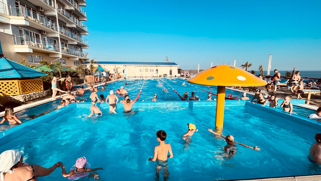 - Близкое расположение к морю.; Хорошие цены.; Замечательный спортивный комплекс, несколько залов, два больших бассейна.; Открытый бассейн в прекрасном состоянии.; Есть спортзал, бассейн, выход к пляжу.