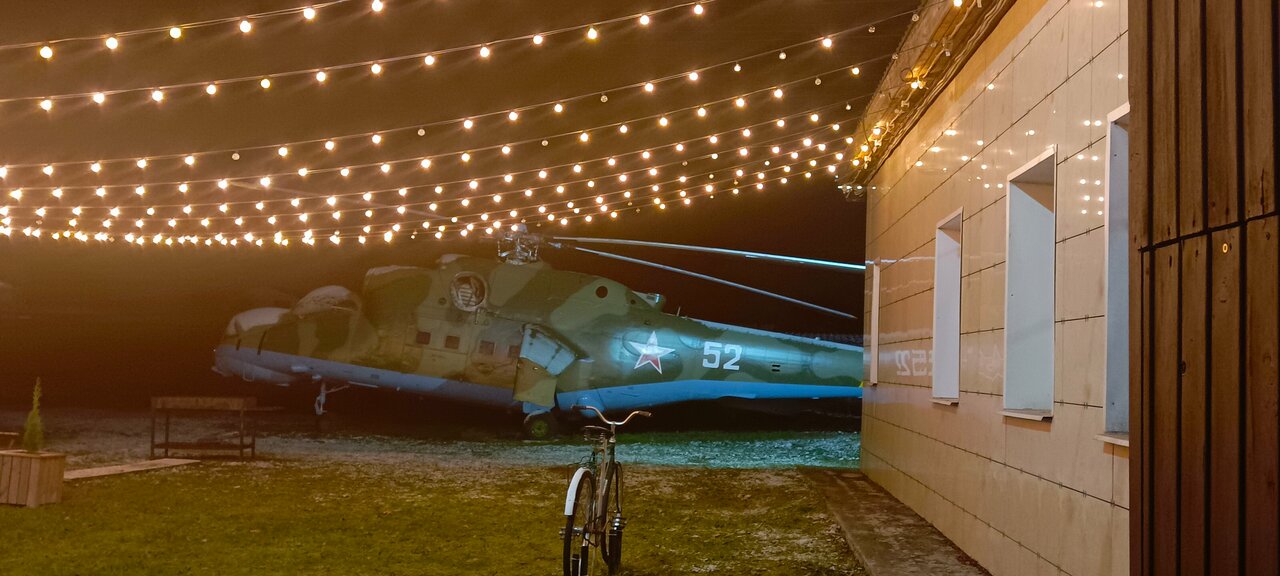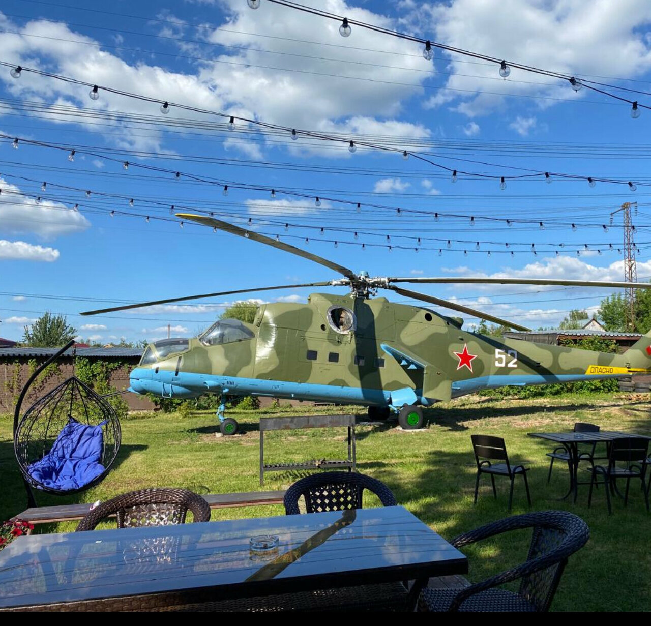 Отличное место, отель соответствует названию, все пропитано духом авиации: и место и история. Даже настоящий вертолет припаркован! Есть баня с бассейном и мангальная зона.