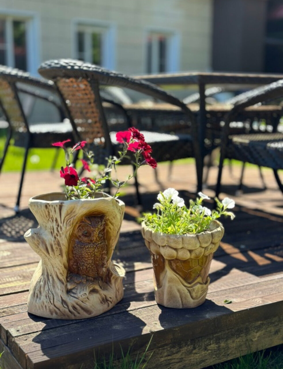 Скромные, но милые номера. С лёгким ароматом давно эксплуатируемой гостиницы. Кондиционера нет, но нам выдали вентилятор. Минихолодильник, чайник, подставка под чемодан — все есть. Кровати удобные. Сауна просторная, бассейн с ледяной водой тоже солидных размеров. Внутренний дворик, украшенный вертолётом Ми-24, очень уютный. Оформление интерьера в авиационном стиле — чем-то огонь (коврики у двери в номере, подушки), в чем-то не очень (манекены в летных костюмах не то чтобы делали коридоры уютнее. Посуда для самостоятельной готовки на кухне — позор, сковородки пора выбрасывать. Тем не менее в целом очень приятно (дворик перекрывает всё). Думаю, приедем ещё.