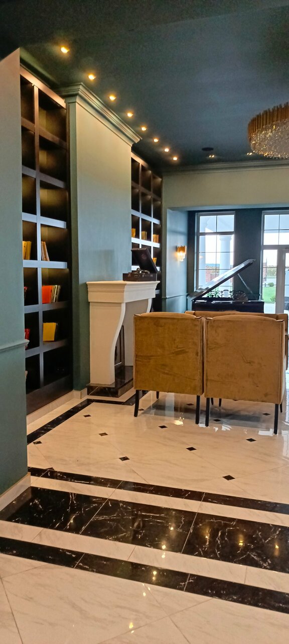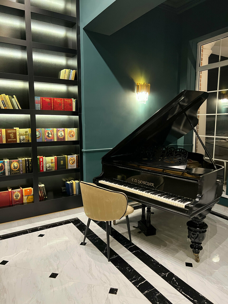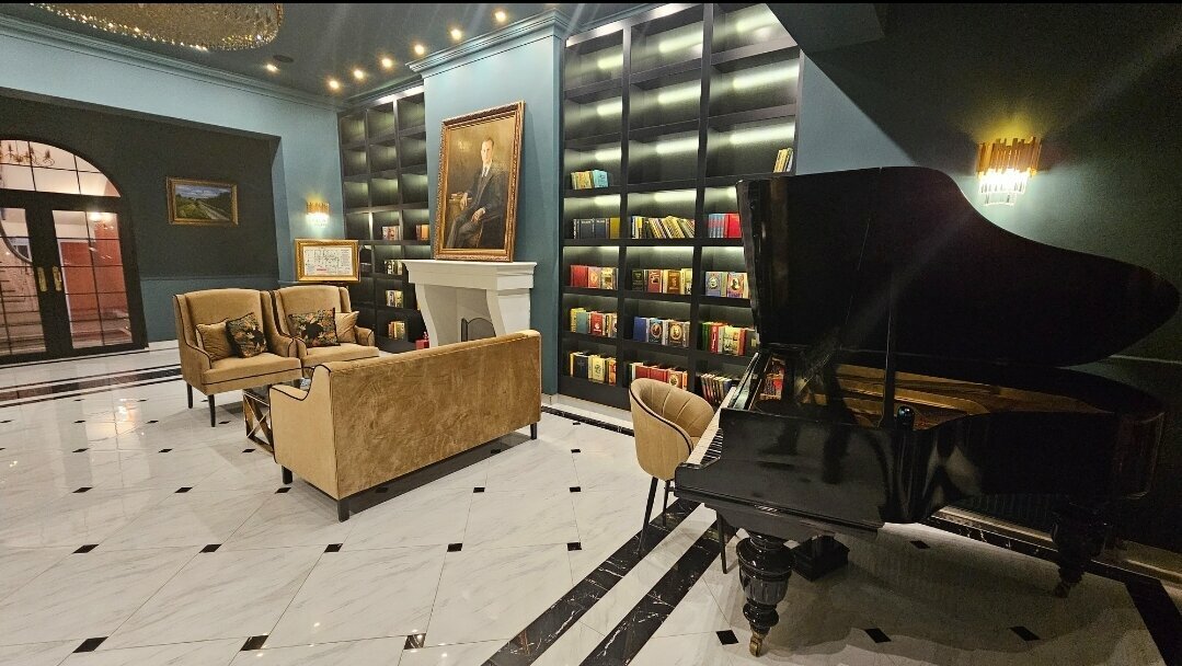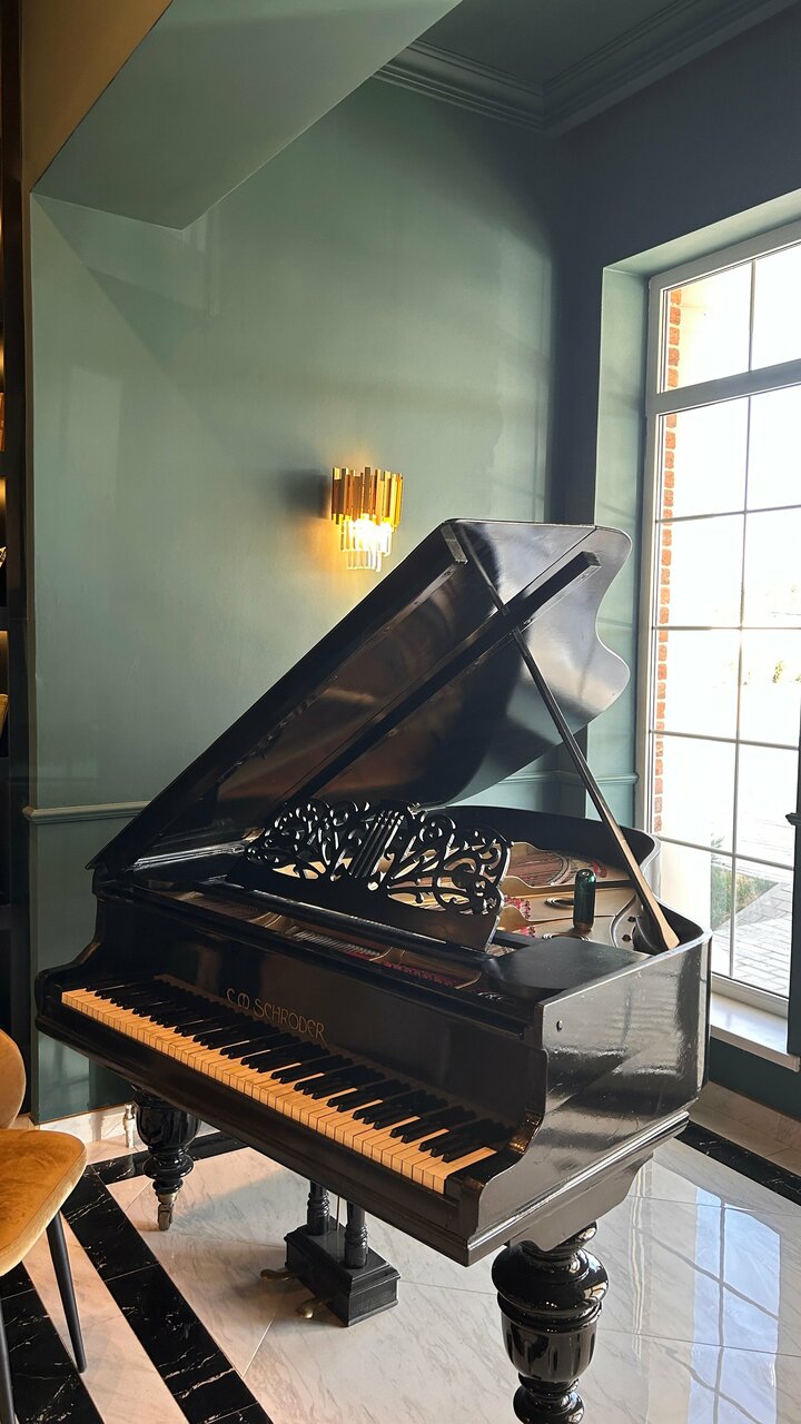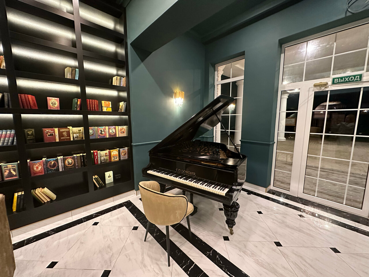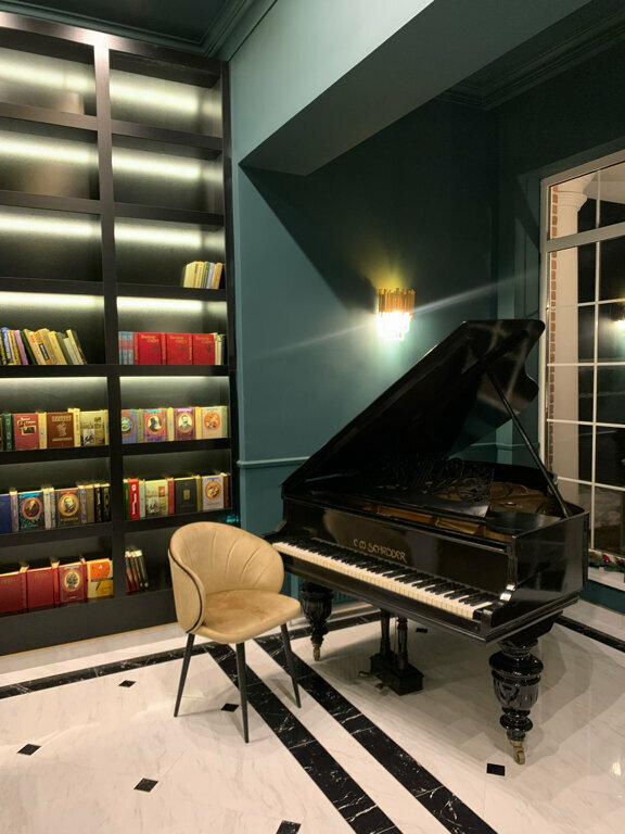 - Атмосферное оформление (рояль, библиотека).