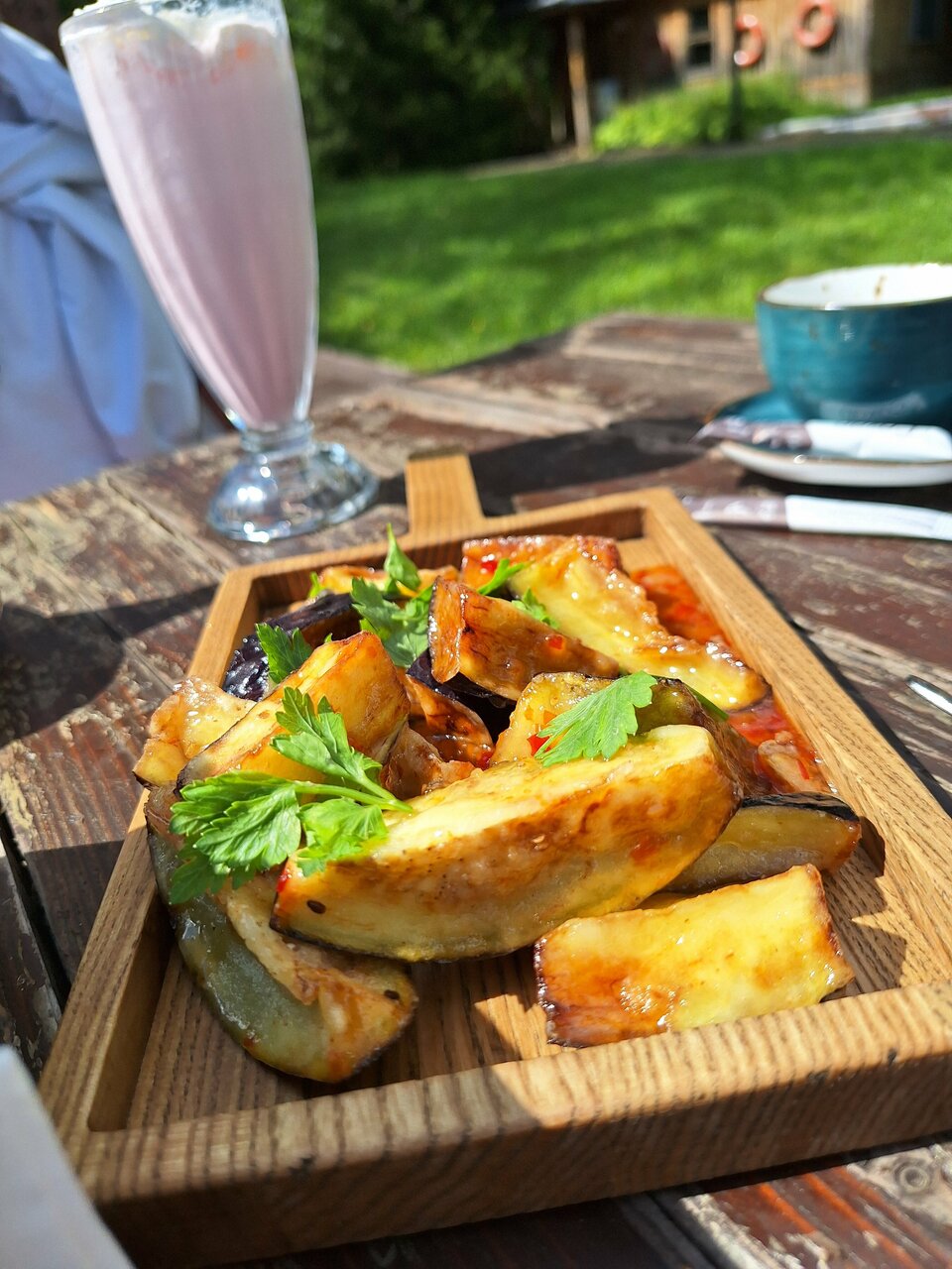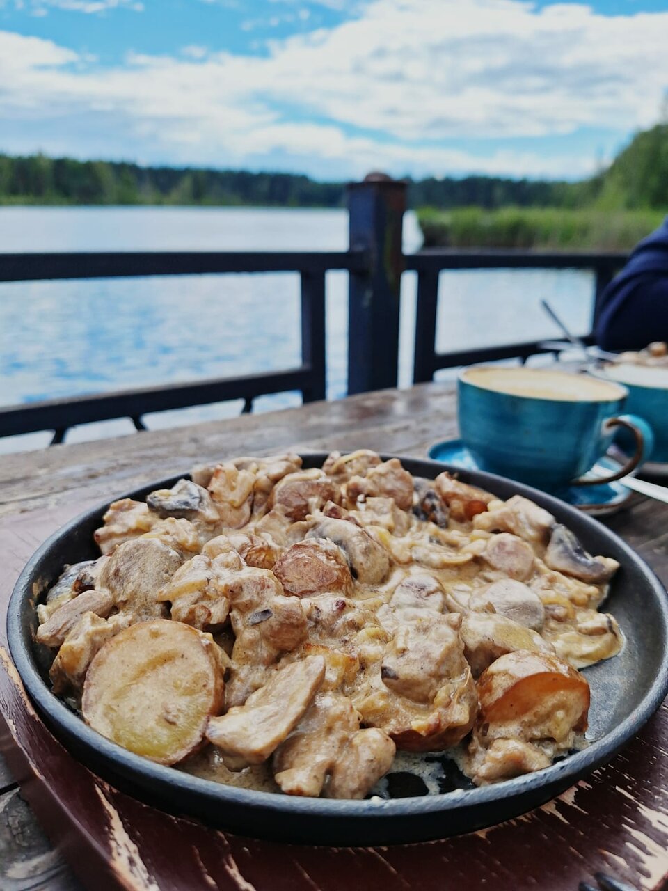 Тихое уютное место, людей было немного, хотя малюсенькая парковка заставлена полностью. Заезжали перекусить, кухня вроде ничего, правда, не все, что в меню, можно заказать. Персонал вежливый и приятный в общении. Впечатление от места — желание попробовать остаться на пару суток: посидеть на лавке возле пруда, почитать книгу, поплавать на лодке, прогуляться по лесу.