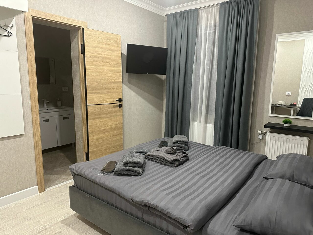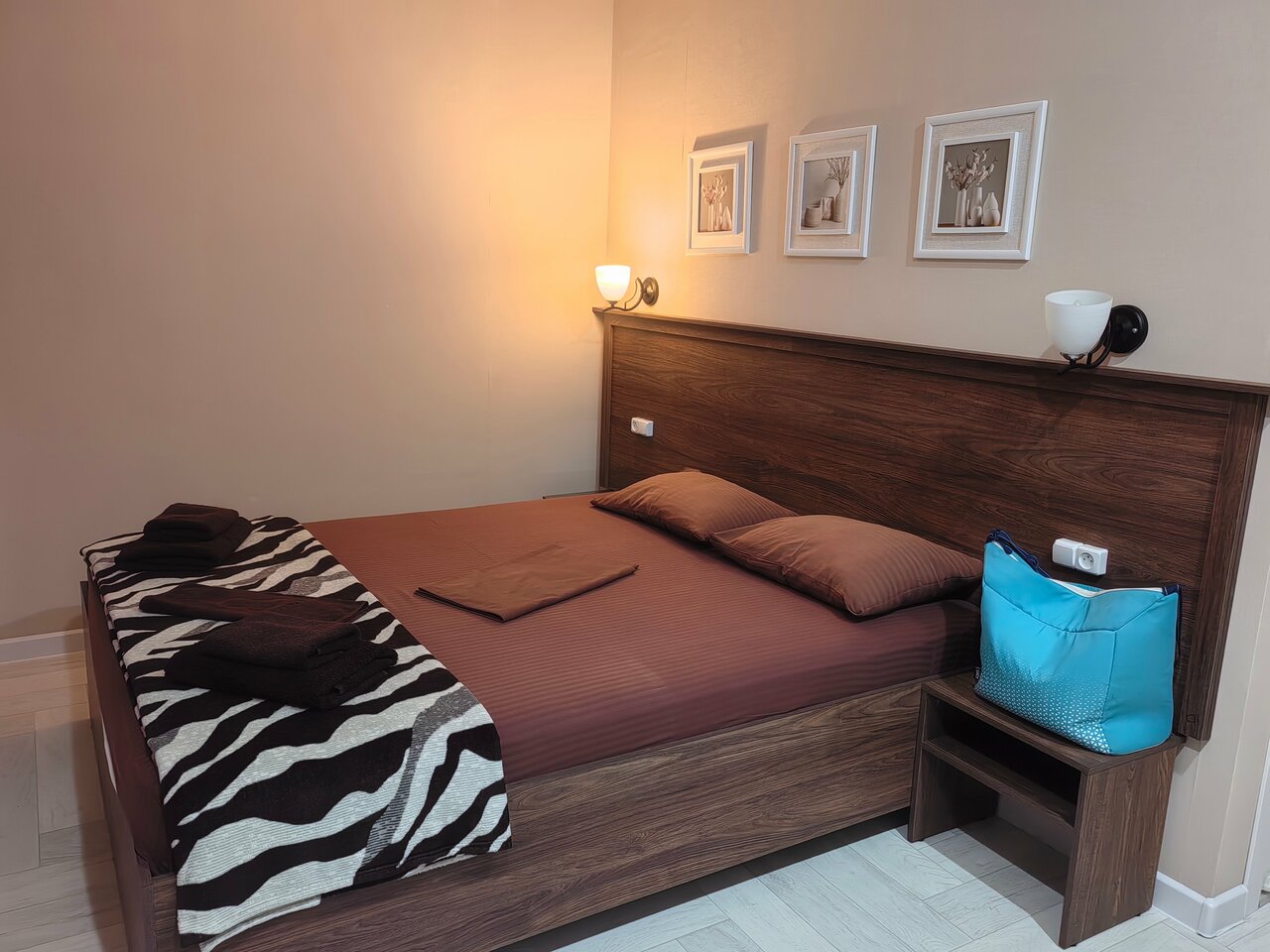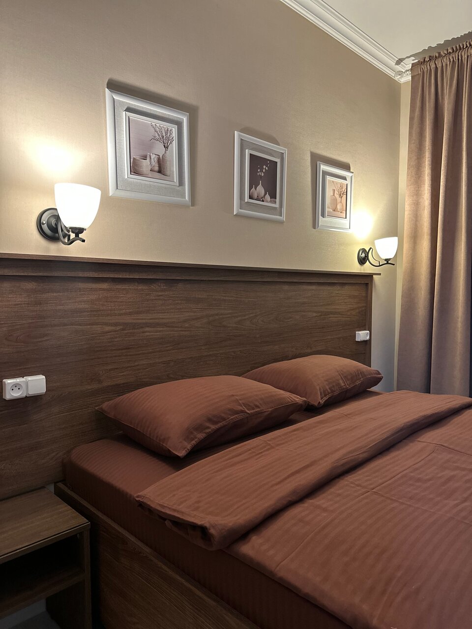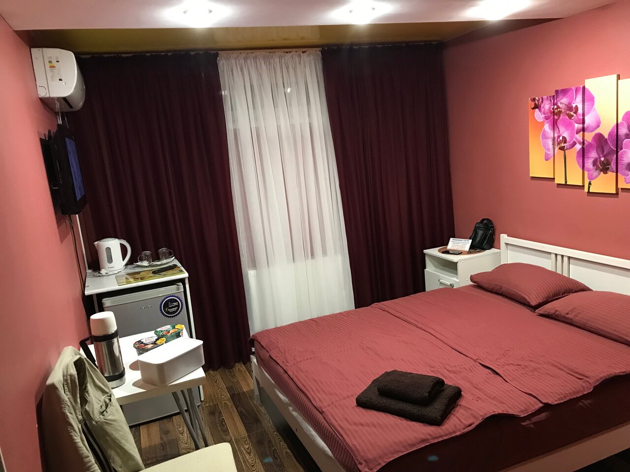 Однокомнатный улучшенный номер. С двуспальной кроватью. В номере имеется холодильник, чайник,.ТВ,Wi-Fi. Санузел в номере.